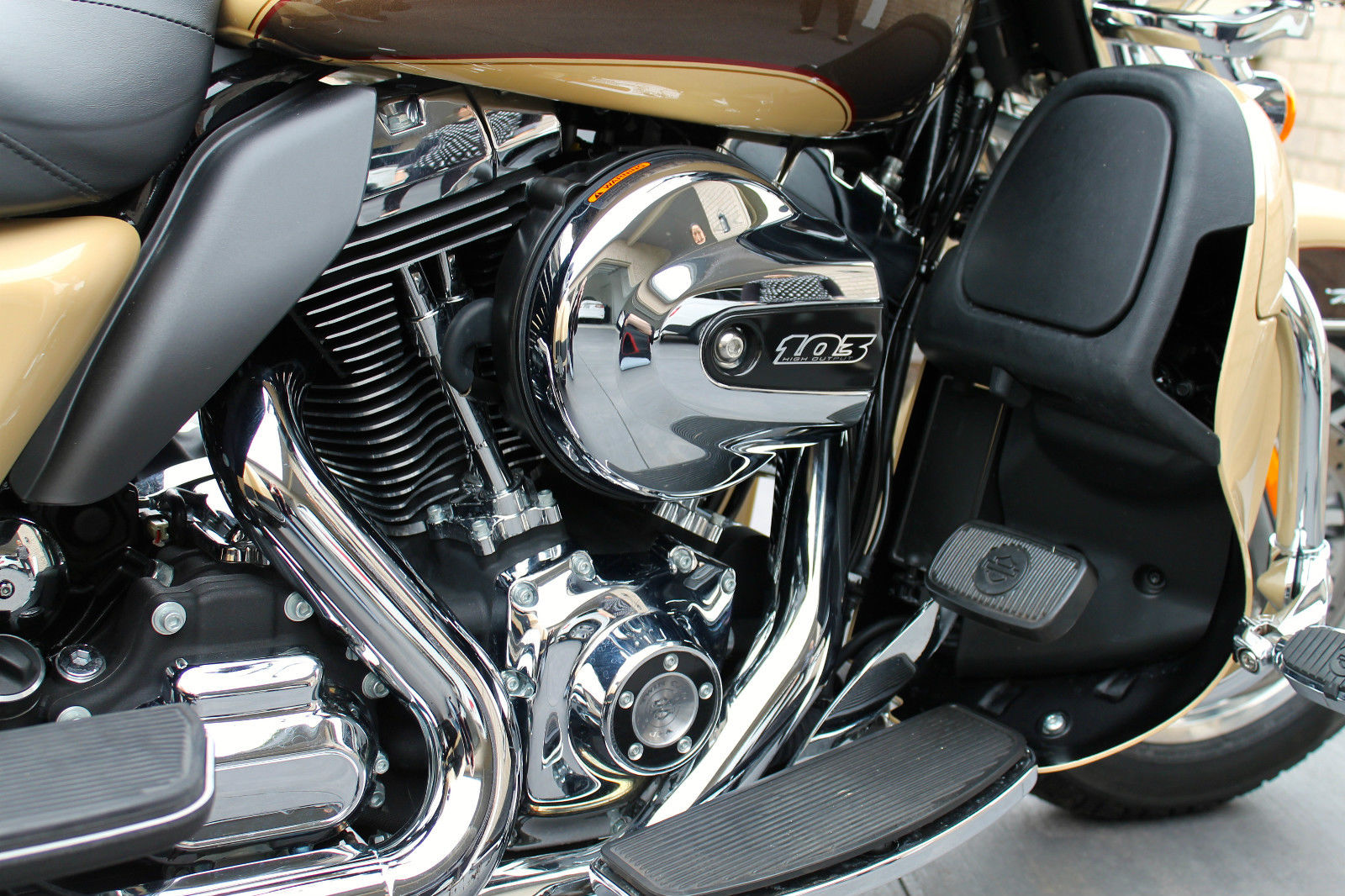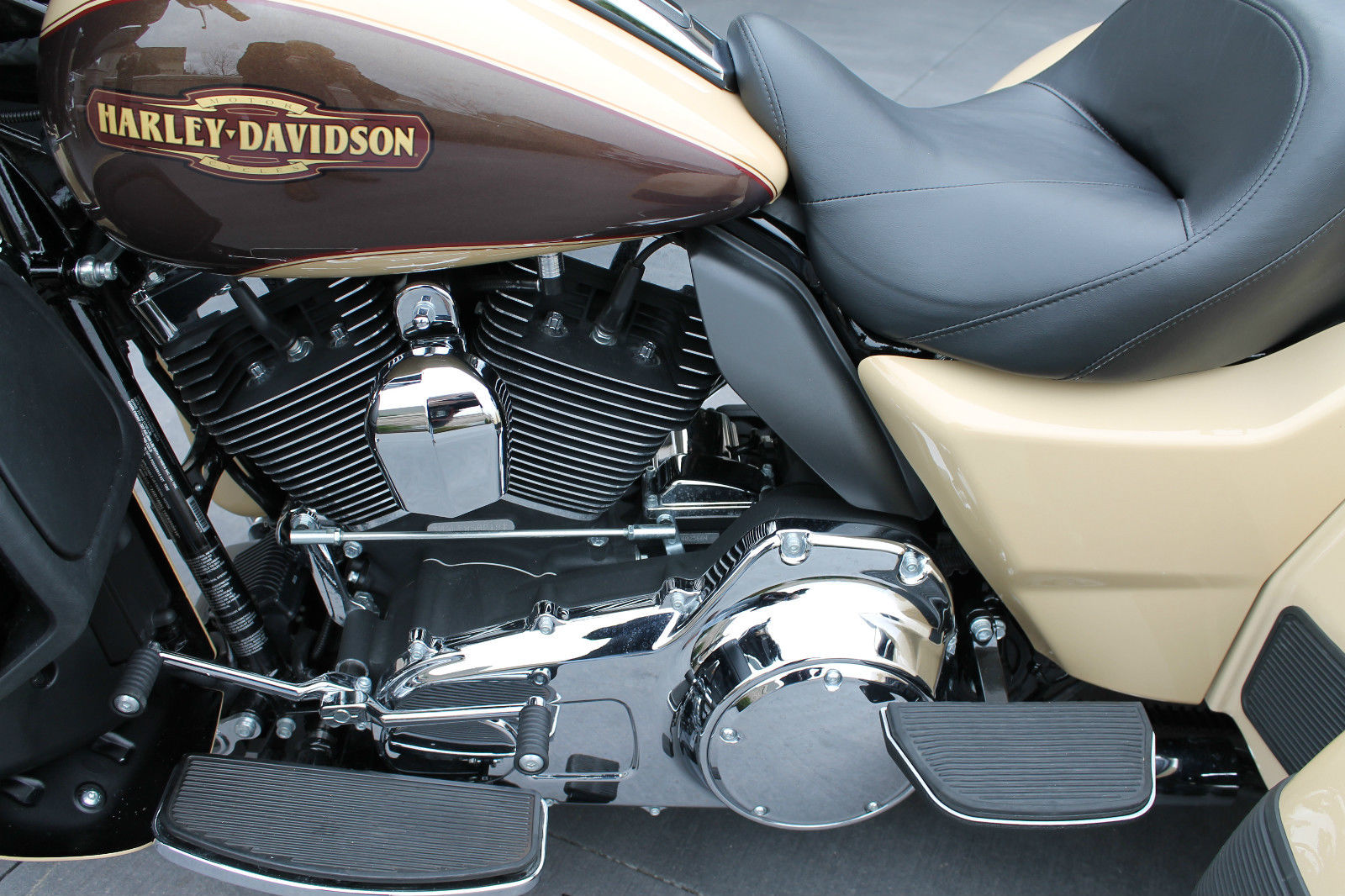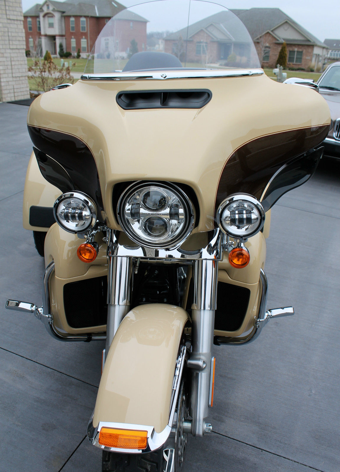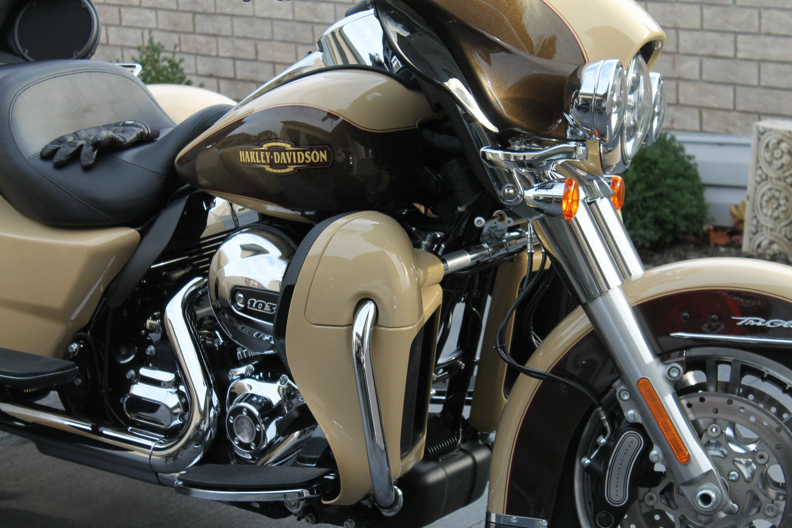 Old school brown color Trike Tri Glide Ultra with customized H-D parts.