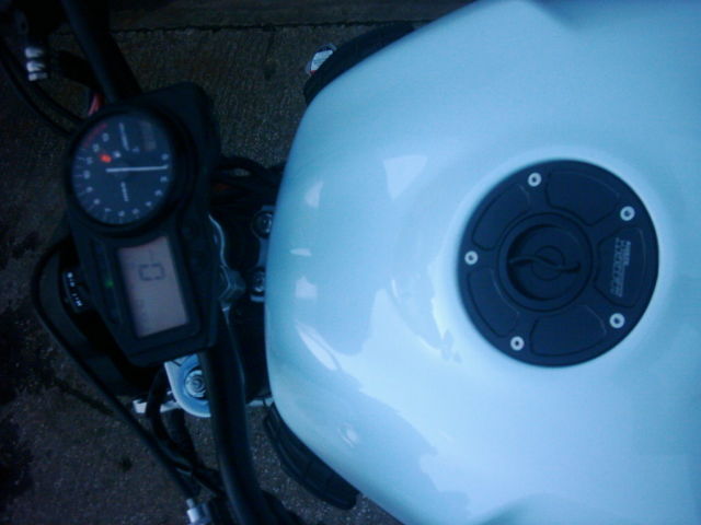 Harris rearsets. djustable bar end mirror with anti glare. BM top yolk. treetfighter etched heel plates. 5 tooth front sprocket. renthal 42 rear. oloured chain. T01 style headlight. ed front indicators. ear integrated turn signal+brakelight unit. ustom front mudguard and belly pan. amco hose kit. ell brake lines. ustom front brake reservoir. earl white paint. satin black frame. arris exhaust hanger. &G cash bungs. ear hugger. ndertray tidy. tubby custom exhaust-sounds awesome-02 sensor eliminator and more besides !!