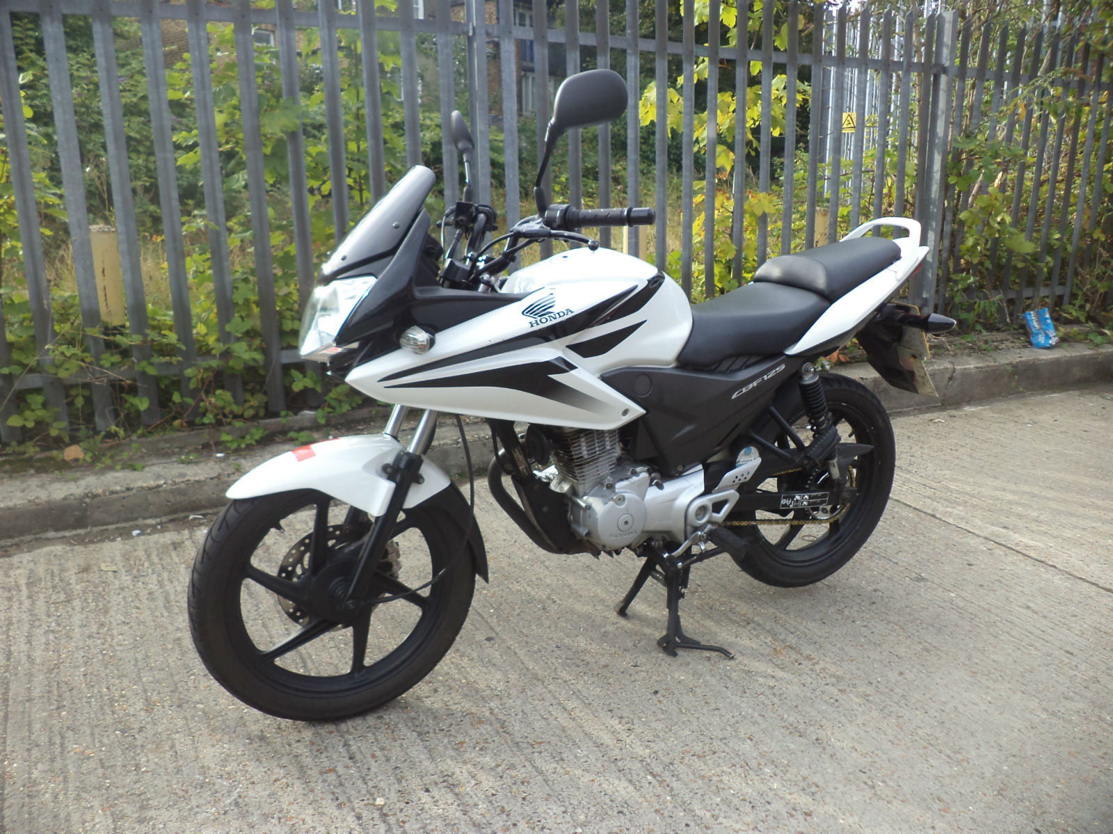 12 months MOT. 12 months tax. Honda's half faired sporty commuter finished in gloss white with contrasting black decals. front disc brake. tinted screen. fuel injection for more efficiency. service book. owners manual. HPI clear. fully serviced by ourselves inc 2 almost new tyres. SELLING WHAT WE ARE HAPPY TO RIDE OURSELVES. K-WORLDWIDE DELIVERY. ww. motorcyclegiant. net,