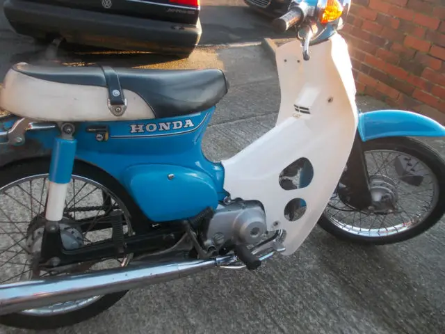Here we have my 1984 Honda c70 in original condition. The bike is in great condition for a 30 odd year old bike with some slight rusting in the usual place on these bikes (around the rear wheel arch-not rotton). The bike comes with 2 keys and full log book in my name. these bikes are becoming really rare to drop on in nice condition. It has 18640 miles on the clock. ith some old mots and paper work with it. Not been on the road since 2002 and been dry stored. it has 2 new tyres. verything works as it should. It has a rear rack that needs putting on with the rear indicators on. small tear in the seat but not too bad. The bike would make a great project to bring back to mint or just put straight on the road. ould go straight through m. o. t in my opinion. Buyer will not be disappointed one bit. No silly offers please. bike starts first kick and runs smooth with no rattles or knocks. any question please ask. may be removed any time.