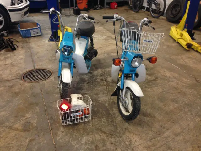 Two 1981 vintage Honda Express SR 49cc scooter mopeds in rare color