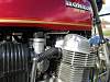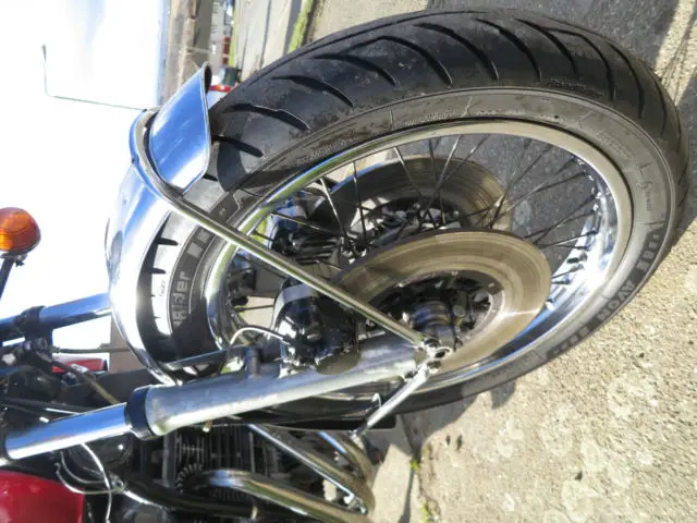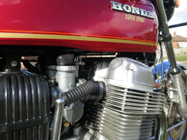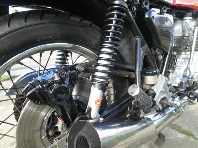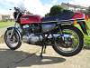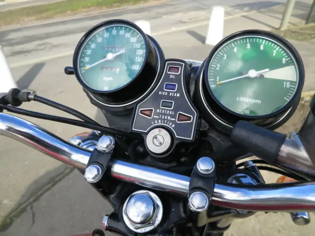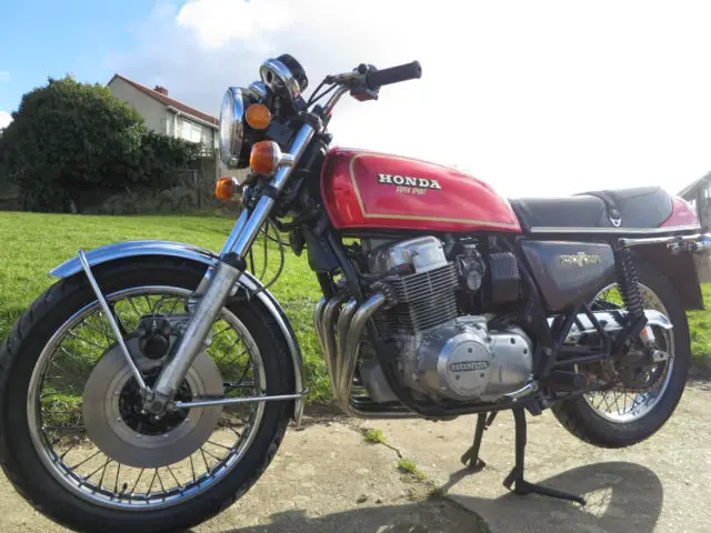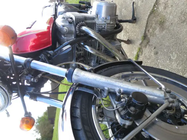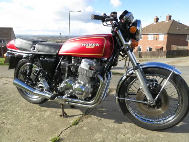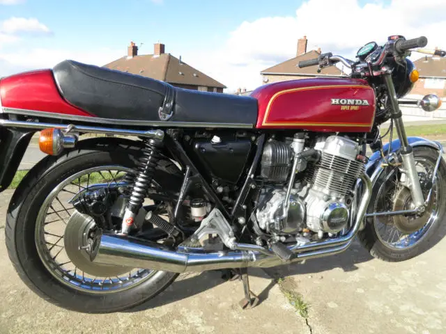 I originally found this bike as an Italian import in 2000 with 6000kms on the speedo. It still had a green painted split link on the chain and untouched manufacturers yellow paint on brake and fork bolts. Looking round the bike I figured it was the genuine mileage this has proved to be the case. The bike had been uprated with twin discs and was in good condition for a bike that had been stood 23yrs. apart from the tank which was rotted at the bottom. I bought a brand new f2 tank which came with all new fittings. the tank along with seat trim was painted in the candy style red you see here . I fully recommissioned the bike. The carbs needed new gaskets and I uprated the shocks to Marzzoccis. the fork springs to Progressives. put new points and condensers . apered steering head bearings in it. Registered it and used the bike a lot over the next 3 years. It was a great bike. I then got myself a few newer machines over the next 9 yrs. The Honda just came out for bike nights etc. someone always wants a chat about it and their own fond memories of ownership. This is definitely a case of 'they don't make em like they used to'. Then in 2012 my new partner started riding so I put the Honda back into full service as it was very happy to ride at learner speeds. At this point I prepared the bike again. I upgraded the shocks to a nos pair of Marzzoccis I bought from Italy. I have the original shocks should you want them but the marzzocchis are a marked improvement over them. As are the progressive fork springs. I fitted new brake pads all round. Fitted new phosphor bronze swingarm bushes. Serviced the forks. new seals and oil. Fitted new genuine oem points and condensers and as an upgrade I had read about. Honda GL 1000 coils which Improve the ignition system. The air filter is an american High flow foam element. and the exhaust is a standard header 4 into 1 with a Kerker muffler. It is in good condition . Sounds nice but not too loud. I replaced the header with an oem replacement. The original was rotting on one of the down pipe connections. I fitted new Avon Roadriders at this point. The original speedo is supplied with the bike and shows 28673kms at which point I found a nos mph speedo which now shows 22194mls. The total miles on the bike now come to 17816 + 22194 which is 40010 Miles. I am a trained motorcycle mechanic and the bike has been maintained very well. Oil and filter has been changed at worst every 2000 miles often less throughout my ownership. Cam chain has been meticulously adjusted far more often than Honda deem necessary by myself and the original cam chain is still quiet. The primary chain is noisy on tick over. as it always has been but the bike sounds really sweet after a good run. I still have the original rear sprocket guard and metal spark plug caps that were on the bike when I found it. I have put stainless brake lines on and have the originals too. I have the original F1 tank fuel tap . a couple of sets of new brake shoes and new clutch plates which I bought in haste when the clutch appeared to be slipping. It had been stood a little while but soon bedded in with a couple of journeys. It proved sound so still on original. All spares are included. The bike rides really well. very smooth and the engine is strong. The bike is a credit to early Honda build quality. The tappets have been adjusted on a few occasions although I am fussy and the carbs balanced but apart from that I think all it has needed has been a couple of front brake arm services and occasional adjustment. new wheel bearings. a couple of batteries. a couple of chain and sprocket sets and a few tires. I have always used Avon road Runners on it. The rear Roadrider I fitted in 2012 is ready for replacement. I have had the bike geared up 1 tooth on the front sprocket all its life which it pulls no problem at all. so It has done quite a few less revs than it would have done with standard gearing. Last time I rode the bike was to Scotland which was a real pleasure. Apart from losing one of the side panels and damaging the other (lifting it onto the centre stand). It is all as it left the factory apart from what I have mentioned above and still looks very well. Chrome is generally good. as is paintwork. It is as honest a bike as you will find and ready to go. Viewing is recommended. Please call Dan with any questions. 07775 016973. Cash on collection please.