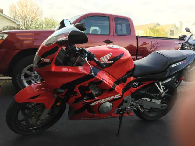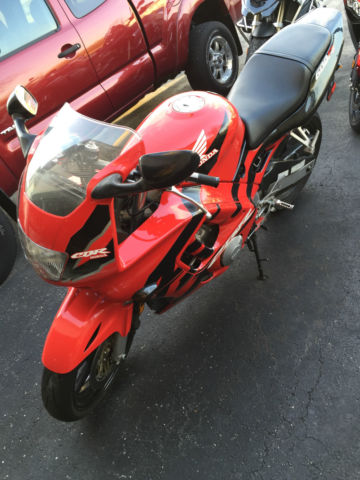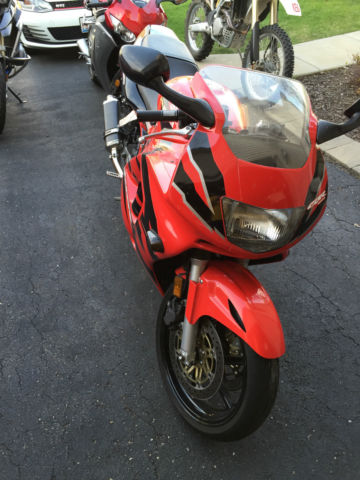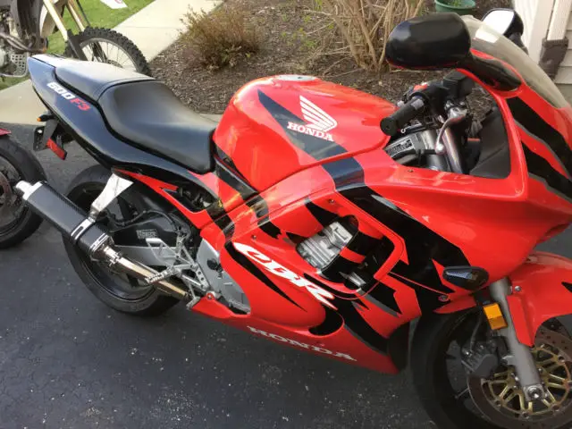 1998 Honda CBR 600 F3 (red/black). This is the last of the steel frame CBR 600's. Clean title is in hand. It has about 15k miles on it. Near perfect condition and always garage kept. I am the second owner. First owner was from Wisconsin for which this was 1 of 3 he owned at the time. Has original fairings and never dropped. Never raced. Never driven in the rain. Has Shorai race battery which shaved 7lbs off the bike (2 years old) and has been on battery tender all winter. Has aftermarket carbon fiber Delkevic exhaust (14" and 350c) with removable baffle which shaved 8lbs off bike. It has a throaty sound with the baffle in but really roars when baffle is out. Last season all 4 spark plugs were replaced with NGK iridium plugs and also put in a new BMC air filter. Chain. sproket. front/rear tires (dunlop sportmax q2) and front bearings were changed in 2012. Has standard adjustable suspension dampening. Bike also has updated carbon fiber turn signals. updated foot pegs. and aftermarket grips. I took the stock rear footpegs off to shed some weight. and will put them back on the bike when it sells. Carbs were last cleaned in 2012. otherwise oil changes at the start and end of each season. and chain cleaned each season. Bike runs smoothly and always starts. I encourage you to come look at the bike in person and/or talk with me over the phone prior to bidding. Bike is for sale under other listings and could go at any time. Buyer is to arrange for pickup and transport. I am more than happy to help with loading the bike.