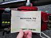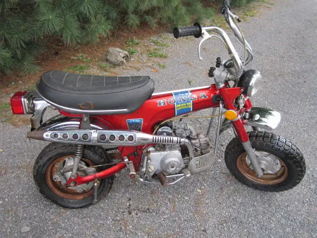 1972 Honda CT70 that needs some work. Most of this bike is pretty solid and should not take much to be a runner. -What it absolutely needs to run is a gas tank and a spark plug cap for the coil wire (I myself would buy a complete replacement coil with with everything off ebay). -Front brakes work but the back drum brakes are tight and will need attention. Back brake hand lever is stuck but foot lever is not. -If you want the seat to be nice I would not just cover it as the metal base is bad (someone picked it up by the seat and bent the base) so you would need a complete seat to be perfect. It does latch down if you want to leave it as it is. -Tail light is cracked-Tires should be replaced as usual although front does hold air-Passenger foot peg is bent-Front fender has a dent/s-Looks like right handle bar is bet/twisted-Looks like headlight mounts are bent-Typical surface rust in some areas but no badMost if this is basic stuff for a vintage bike that has been sitting for a long time in a barn. I've only looked over it and cleaned it up a bit. I cleaned it up because it was really dirty and even looked like it had some manure on it. It also sat in my shed for 6 months untouched. I did not mess with the motor or tear anything apart. May also be missing some nuts. bolts. or other hardware as expected. It has less than 3. 00 miles on the motor and it turns over well. Everything looks to be 100% original and almost complete other than the missing gas tank. It does have the key and the owners manual tucked under the seat. I bought this last fall with the intentions of keeping it but I found something else I would rather have which is why I am parting with it. This bike has a lot of potential and could be an easy project to get running just to use as it is. Please take a good look at the photos. You are buying this as is with no warranty. I strongly encourage anyone to inspect the vehicle in person prior to bidding. Remember this bike is 43 years old and sat in a barn for a long period of time. If you have any questions please ask. I prefer local pick up with cash in hand but if you would like it shipped you are responsible to set up and pay for all shipping costs. I will work with the buyer to set up a time to have someone pick it up. This is will also be for sale locally so I reserve the right the end the auction if needed. On May-03-15 at 20:11:40 PDT. seller added the following information:Almost forgot to mention. there is no title with this motorcycle. On May-06-15 at 18:06:36 PDT. seller added the following information:Please read the full description/details!! THANKS!!