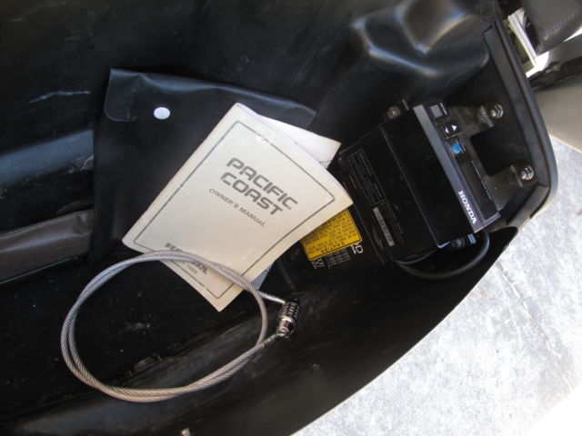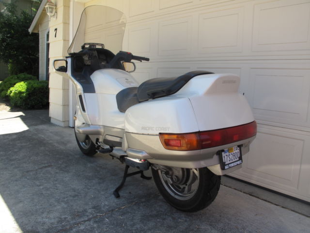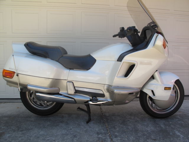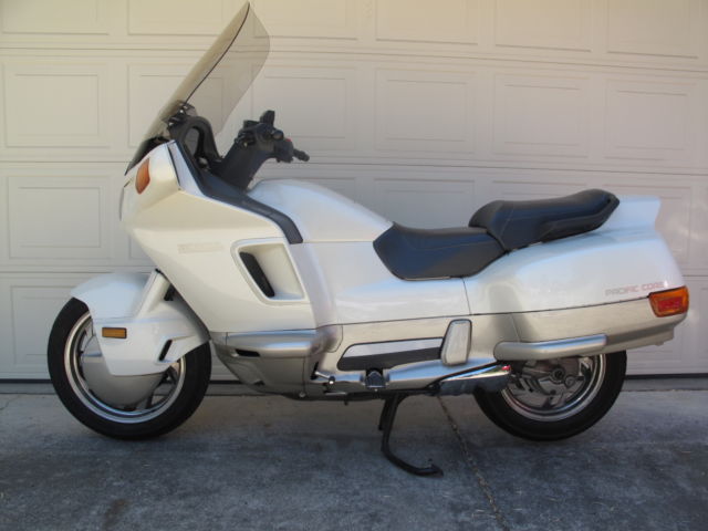 For buy-it-now or auction is a very well kept 1989 Honda Pacific Coast -this is the first year top of the line model. See pics. This motorcycle has never been in an accident and has all the original plastic. New tires battery thermostat and speakers -yes this is the model that came with the factory Honda/Kenwood stereo! All lights horn electrics radio etc work perfectly only 24K miles. Zero sun/weather damage! This is a great motorcycle to ride and commute/tour on. See pic of the storage space under the seat -can easily fit two full size helmets! Clear title can deliver anywhere from Napa to San Jose no extra charge. Has battery tender connected. Includes original owner's manual and very hard to find Honda factory helmet lock!