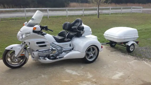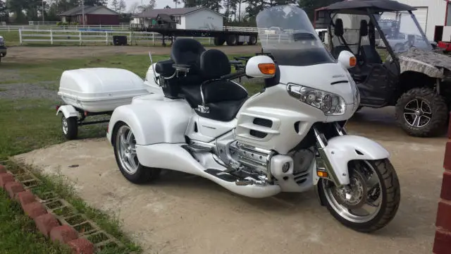 NO RESERVE! 2008 HONDA GOLDWING TRIKE WITH THE ROADSMITH TRIKE KIT, IKE IS IN ABSOLUTE EXCELLENT SHAPE, O FLAWS WHATSOEVER. HAS BEEN ADULT OWNED AND TAKEN VERY GOOD CARE OF. ALWAYS GARAGE KEPT. HAS ALL THE BELLS AND WISTLES. LOOKS GREAT AND RIDES AND DRIVES GREAT. MY WIFE HAS HAD TWO BACK SURGERIES AND CAN RIDE THIS BIKE WITH NO PROBLEMS. HAVE OWNED SEVERAL MOTOCYCLES AND THIS ONE IS THE NICEST AND CLEANEST ONES IVE OWNED. HAS AFTERMARKET PARTS INCLUDING DRIVER BACKREST. PASSENGER ARMRESTS. AND CUPHOLDERS. BRAKES AND TIRES ARE IN EXCELLENT SHAPE. NEEDS ABSOLUTELY NOTHING, EADY TO TAKE ON A TRIP AS WE SPEAK. COMES WITH A PAINT MATCHED BRAND NEW TOW BEHIND TRAILER. TRAILER HAS NEVER BEEN ON ROAD. ONLY REASON WE ARE SELLING IS MY SONS ARE SELLING THEIRS AND BUYING SIDE BY SIDE ATV'S. WE WONT RIDE ANYMORE AS LONG AS THEY DONT HAVE MOTORCYCLES. YOU WILL NOT BE DISAPPOINTED IN THIS TRIKE. LOOKS GREAT WITH THE FLOOR BOARDS. PLEASE ONLY SERIOUS INQUIRES. YOU CAN CALL OR TEXT ME AT 479 858 2860 BEFORE 8PM CENTRAL TIME. TRIKE IS FOR SALE LOCALLY ALSO, O I RESERVE THE RIGHT TO END AUCTION EARLY. MY TWO SONS HAVE A COUPLE OF 2010 HARLEY DAVIDSON TOURING BIKES FOR SALE ALSO, OULD MAKE A PACKAGE DEAL FOR SOMEONE IF INTERESTED. TITLE IN HAND. CASH, ASHIER CHECK OR LOAN CHECK, ILL HAVE TO CONTACT BANK TO CLEAR CHECK FIRST. DONT MISS THIS OPPORTUNITY ON A NO RESERVE BUY!
