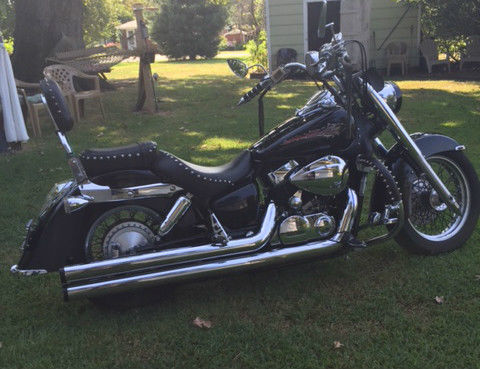 Nice bike with many additions: chrome tips, ftermarket "Double D's" pipes, uryakyn pegs and grips (rubber on grips need replacing as they are breaking down), mp with powered handlebar speakers (just plug in your IPOD or phone and jam out on the road), ngine guards with custom covers. Tires in great shape. Runs great. Local pickup or delivery only in the Raleigh, C area. I have the title. Bike has been lowered 2 inches. Perfect bad-ass starter bike or an every day bike for shorter riders. I will deliver the bike within 50 miles of Clayton, C.