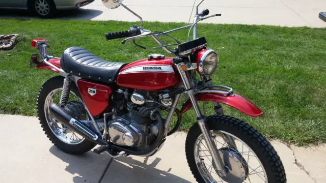 Very nice 1970 Honda SL350. Very original, aint recently redone in original color and decals. Runs very good, little smoke on left side exhaust at start up. Tank is very clean inside. Exhaust has no rust and very solid. Tires are original, ront is very nice and rear has some weather checking. New side covers.Shifts through the gears great with plenty of power. Have owners manual and tools. Clear tile in my name. Would look great in someones office.
