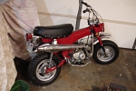 Frame: Completely dissembled, rimed base coat, op coat, nd cleared in matching Honda Ruby Red color courtesy Mike's MiniTrail Restorations, daho.. New decals and side badges were applied. New OEM chrome strip on frame top. Seat hinge and tank cover powder coated in gloss black. Battery box, ll nuts, olts and all bare metal parts were re-zinced. New CHP replica seat. Fenders, rake levers, ear tail light mount, rake pedal, ngine guard and front fork extensions were all re-chromed to keep original Honda parts. Handlebars, nd cables are CHP replica's. New OEM grips and throttle assembly. Taillight and lens are new OEM . Foot peg and kick stand assembly powder coated in glossy black and new springs, earings and pivot pins.