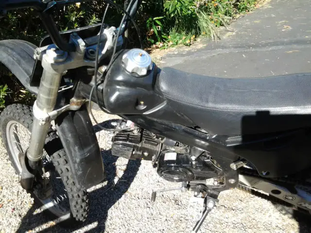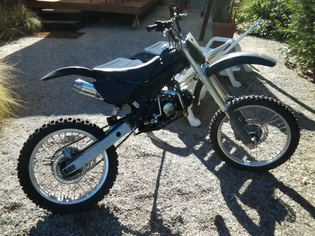 this unusual motor cycle is a combination of two bikes, 125 track bike and a full size dirt bike forks and swing arm, heels and tires. perfect for outdoorsmen, urvivalist, unters, Vers. Please contact me with any questions. a $500. payment due within 24 hrs. of purchase. This motor cycle is sold with a bill of sale without titleand although it's in excellent condition it's sold in "as is" condition this bike has only 100's of miles not thousands