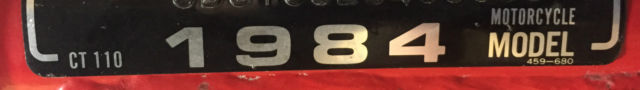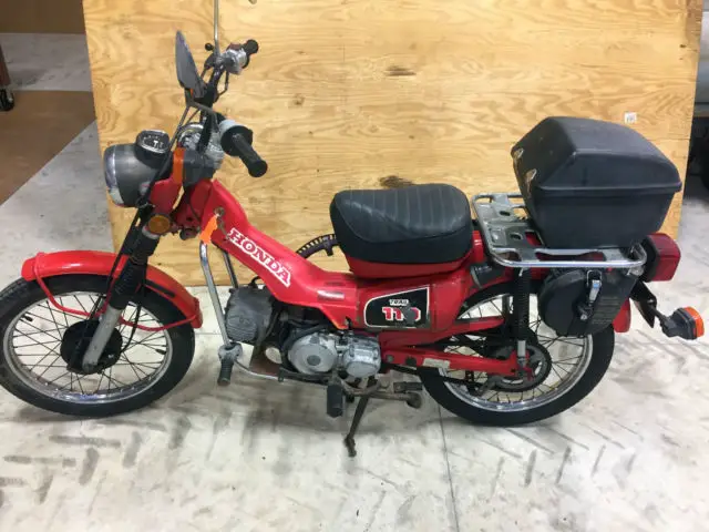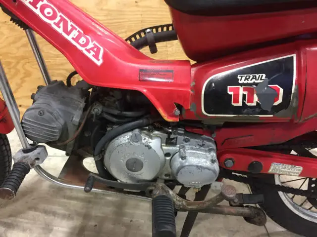 This is a 1984 original Honda Trail 110. Let mestart out so everyone is clear on title. I DO NOT HAVE THE TITLE. The Owner is Deceased. I will give a bill of sale whenpicked up. If you would like to check VIN Please Email Me.The bike currently Runs great. The lights do not work nor does the speedometer. The miles are correct as of last time it worked. Normal blemishes for a motorcycle this age. It does have the extra removable fuel storage tank on the side as well as the rack on the back for storage. Tires are decent and brakes work fine. Battery was just replaced. This item inlocated in Jupiter Fl. If you want it shipped ill be happy to load it on a truck but you are responsible for handling all of that. This item will be SOLD AS-Is with no warranty or Return. If you have any questions concerning the bike or shipping please contact me before bidding. There will be NO-Reserve so Happy Bidding andGood Luck.