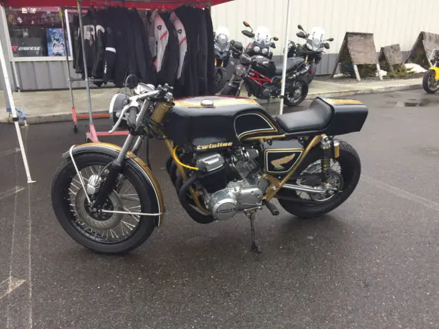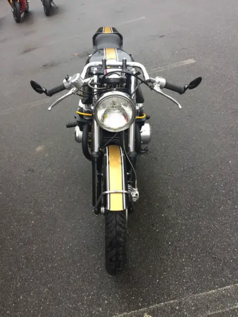 Customer stated he had over $ 16000 in to this bike! It has a recent battery and runs well. Custom Exhaust claimed by the previous to be by "Pops" Yoshimura. The frame has been painted Gold and looks extremely nice. The fuel tank is fiberglass and is custom, he seat section of bodywork is custom and made of metal with a comfortable seat with seat cover and padding. Polished Rear Swing Arm and the rear shocks are adjustable and color matched with Gold and Black to accent the bike. New Tires. Adjustable Clubman Bars, teel Braided Brake line with pressure switch for brake line and CRG Bar End mirror complete the "look". Headlight works with both High and Low Beam Settings and the tail light is operational as well.