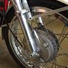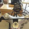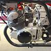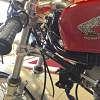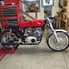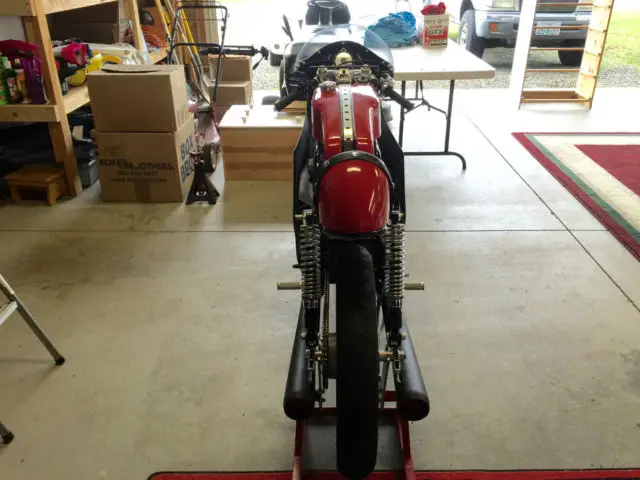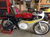 Honda 1968-69 CL175 sloper style engine in a Taylor Racing frame from the UK, he frame is bronze welded like the Honda Factory Racers of the 1960"s. The forks are 35mm Ceriani replicas, he rear shocks are Hagon, he steering head has tapered roller bearings as well as the swing arm mount, he front brake brake is a twin sided single leading shoe Grimeca laced to a wm2 shouldered aluminum rim with stainless spokes and nipples, he rear brake is a CB160 laced to a wm2 shouldered aluminum rim with stainless spokes and nipples, he seat is from Airtech-Streamling fiberglass CR110 copy, he fuel tank is aluminum from Ireland, he fairing is also from Airtech and is their CR93 copy, he engine mods are as follows: the cylinder head is ported and has larger intake valves from a modern superbike, he camshaft is a Norris grind and runs in ball bearings instead of the stock plain bearings, he carbs are from an SL350 and are modified, he crank is lightened the clutch is lightened, he oil pump is bored larger, he cam chain tensioners have sprockets instead of rubber rollers, he displacement is apprx. 194cc, he crankcase has a reed valve breather and a oil cooler, he tachometer is a Scitsu 0-14000 rpm, he chain and sprockets are smaller than stock (RS125 size), hank you for your interest
