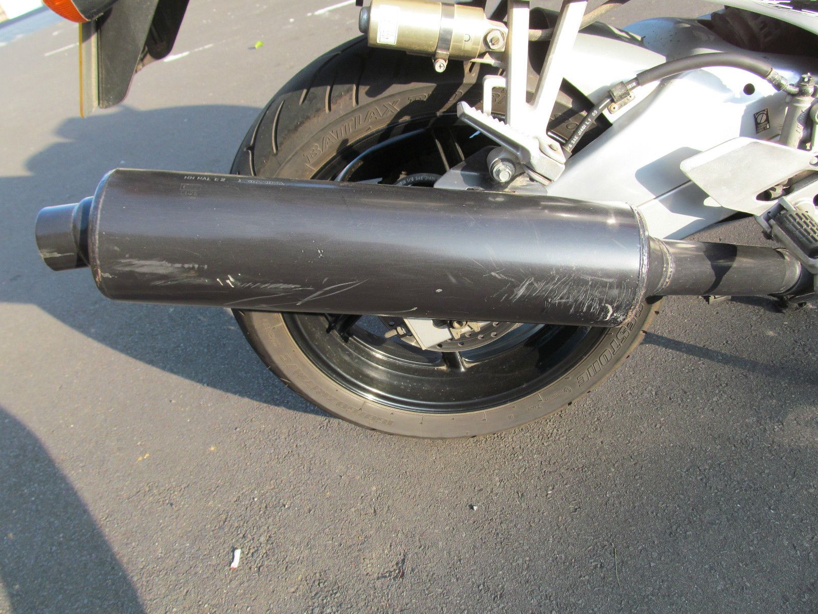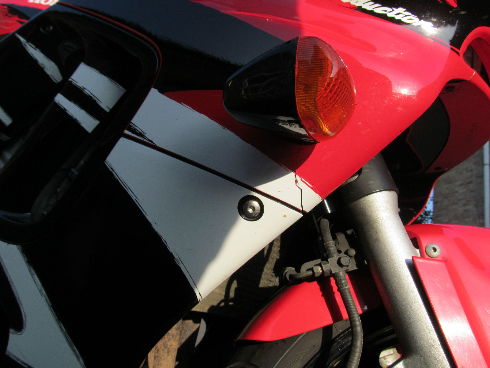 There are some marks on the fairing and mirrors the worst being a small crack below the right hand front indicator (see photos) the marks are commensurate with the age of the machine and would appear to be made by pushing in the garage or gateway to a house. certainly I would say that it has not been down the road. Front exhaust header pipes have some corrosion on them.
