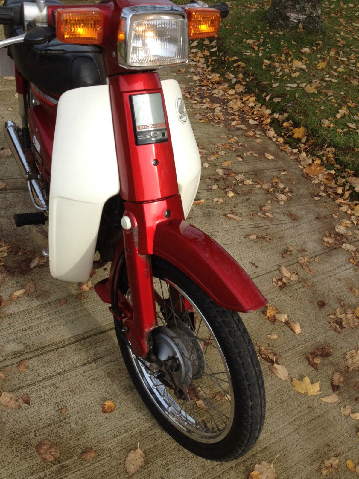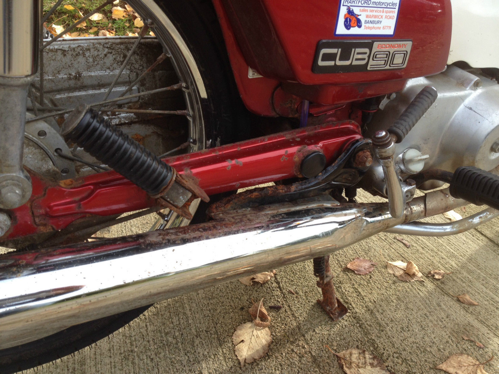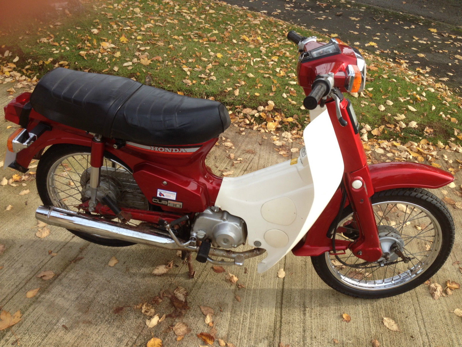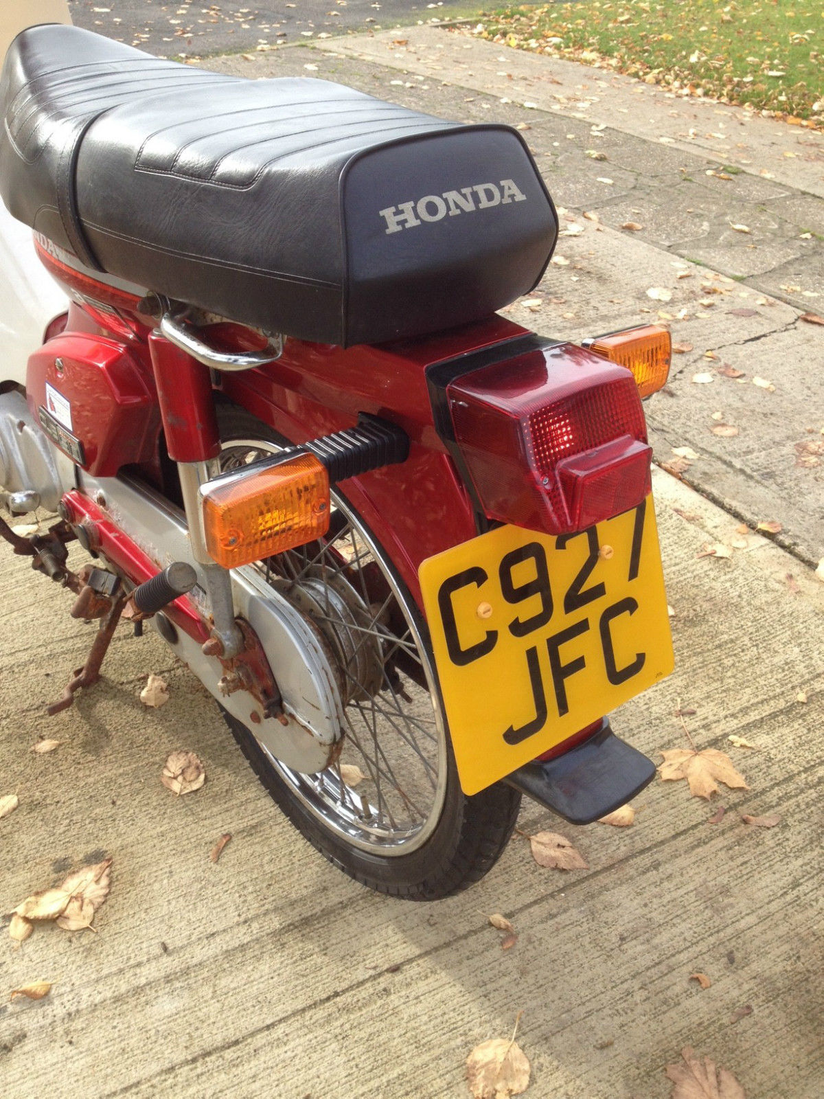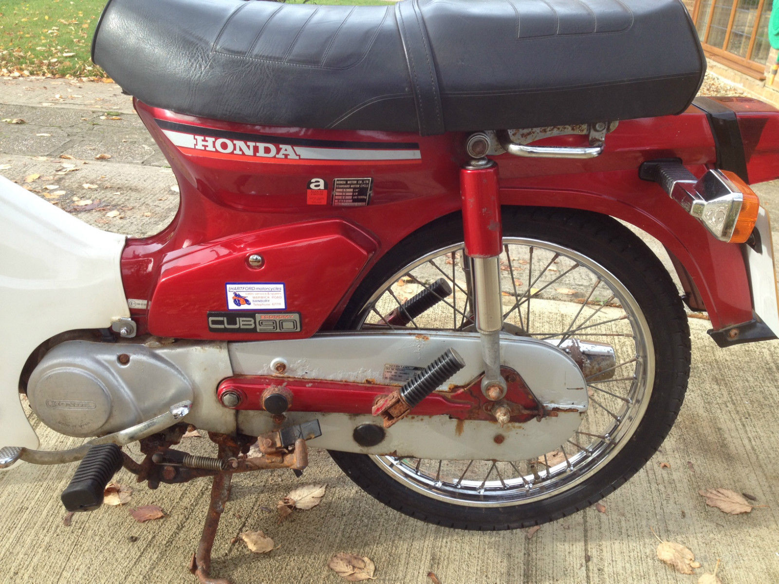 1986 HONDA C90 E CUB. ONE PREVIOUS OWNER AND FOUND IN A BARN 3 MONTHS AGO. HADN'T BEEN ON THE ROAD IN 20 YEARS BUT PASSED ITS MOT TODAY! I HAVE CLEANED THE BIKE AND RESTORED IT TO A VERY PRESENTABLE CONDITION. I HAVE FITTED NEW REAR INDICATOR STALKS. NEW BATTERY AND REAR LIGHT. CARBURETTOR REMOVED AND CLEANED. NEW CHOKE CABLE AND ALSO NEW FRONT RUBBER FOOT RESTS.