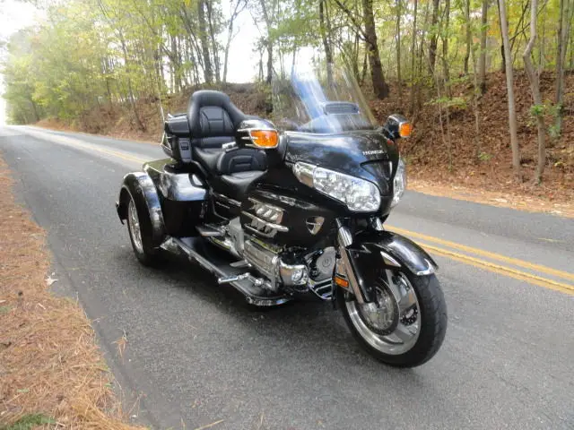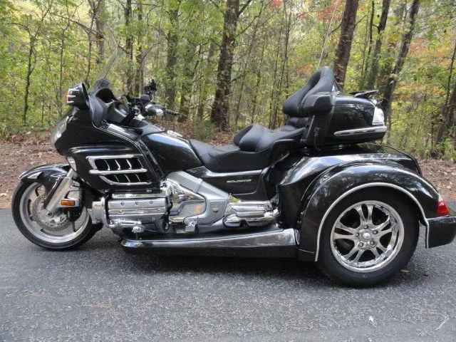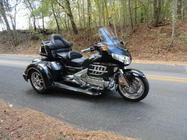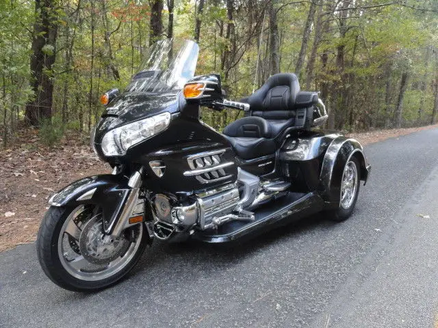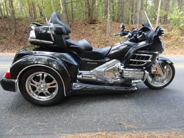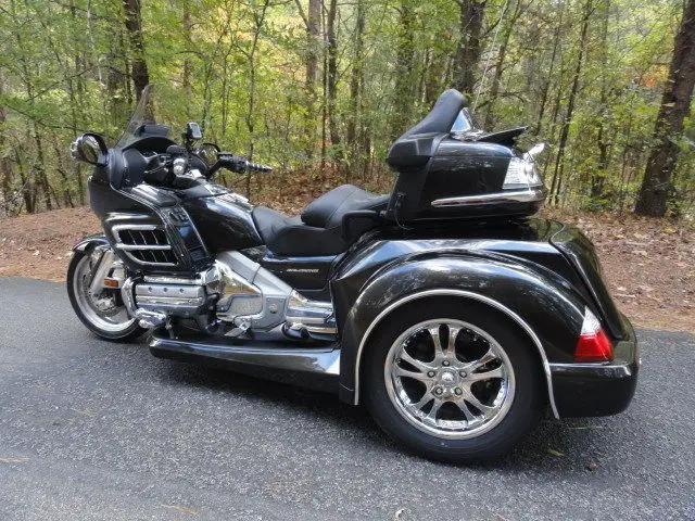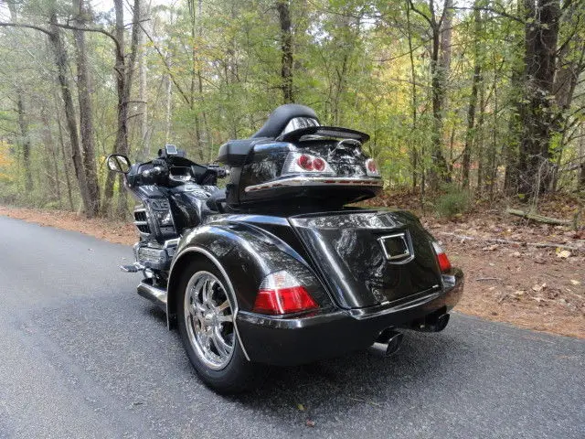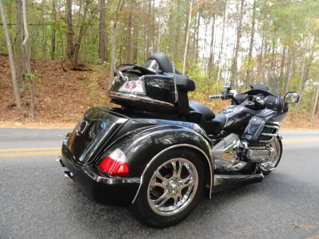 2010 HONDA GOLDWING GL 1800 w/ TRIKE SHOP'S NEWEST ROADSMITH CONVERSION KITCHECK OUT THIS COLOR!!HAVEN'T SEEN THIS COLOR ON A TRIKE TO OFTEN. THIS IS A BEAUTIFUL NEBULOUS BLACK METALLIC IN COLOR. GORGEOUS COLOR!!!!!!THIS BIKE COMES WITH ALL THE 1800 OPTIONS INCLUDING AM/FM RADIO. DRIVER TO PASSENGER RADIO. CRUISE CONTROL AND REVERSE. EXTRAS INCLUDE: CHROME TOUR BOX MOLDING w/ LIGHTS. KURYAKYN LIGHTED TRUNK HANDLE. REAR LIGHTED SPOILER. KURYAKYN HWY PEGS. CHROME STEP PLATE. CHROME BEAR CLAW GLOVE BOX AND BEAR CLAW GAS TANK TRIM. CHROME RADIO ACCENT. KURYAKYN GRIPS. HEATED GRIPS AND HEATED SEATS. TOMTOM GPS. CHROME BEAR CLAW ON REAR VIEW MIRRORS. CHROME FRONT LOWER COWL. CHROME CAM COVER. CHROME GRILL INSERTS. CHROME ACCENTS ON FRONT FENDER AND FRONT FENDER EXTENSION. THIS BIKE HAS THE EZ-STEERFOR MORE INFO ON THIS BIKECOMPLETE CYCLEROME. GA. 706-331-9783 OR 706-378-4855
