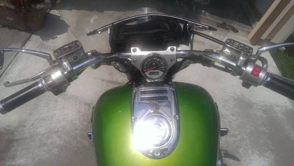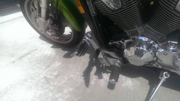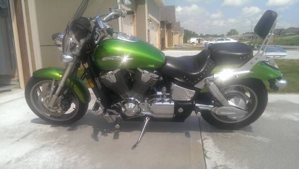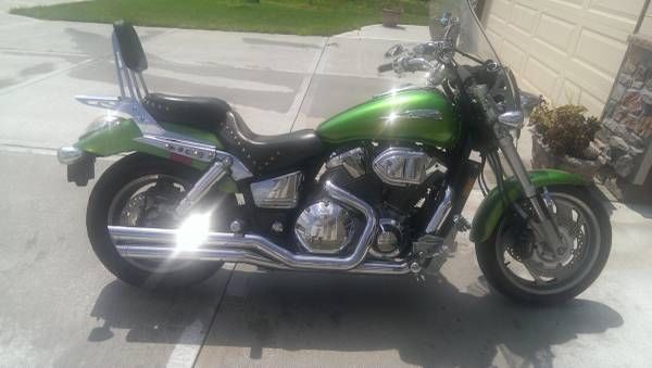 Uranium Green 2003 Honda 1800 VTX model C with 42+K miles that looks. runs. and sounds great! This bike rides out extremely well and has a wonderful top end ride. Shaft drive. water cooled/air cooled. fuel injection. 5-speed transmission all help make this bike an extremely enjoyable bike. Not much more for you to do to this bike. current customizations : mustang driver and passenger seats with removable drivers backrest passenger back rest and rack hard leather saddlebags with quick release ghost brackets for easy removal chrome side covers chrome drive shaft cover fuel management system windshield hyper charger vance and hines big shot pipes progressive springs in front forks custom clock add-on to tank assembly kuryakyn highway pegs new front tireback tire - about 60+ percent left new brakes and other little things. Thanks for looking.