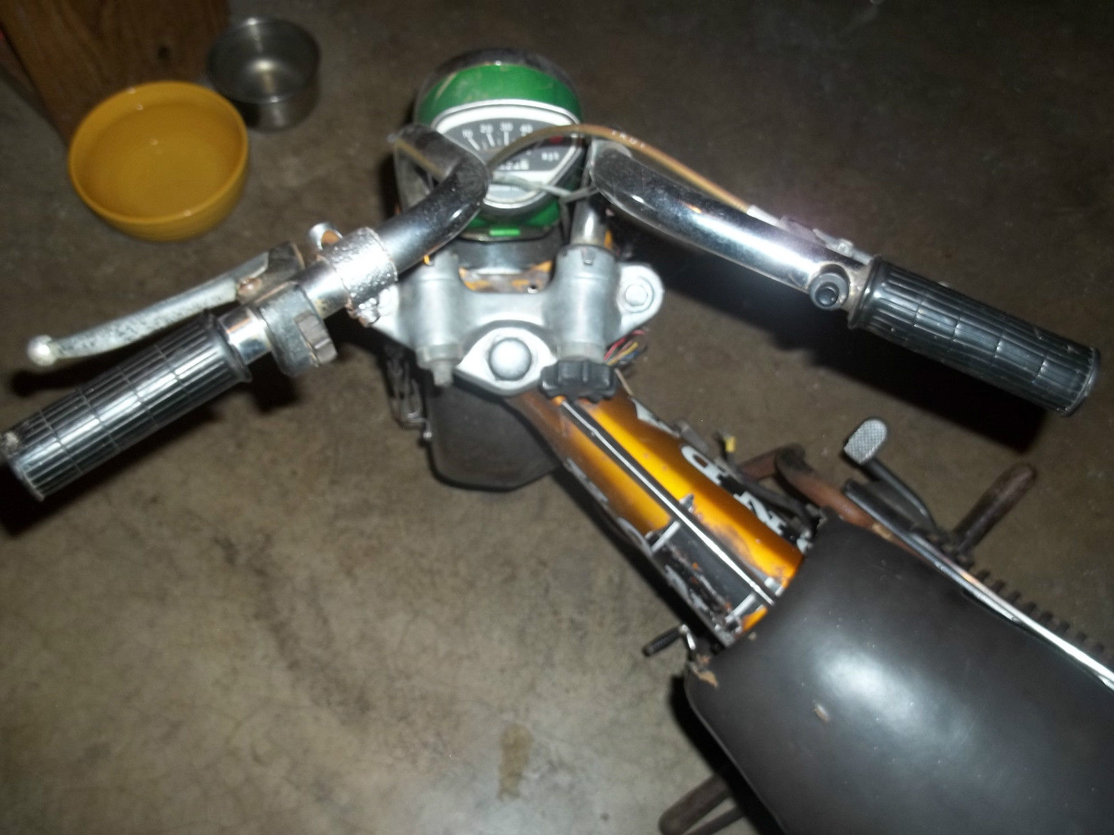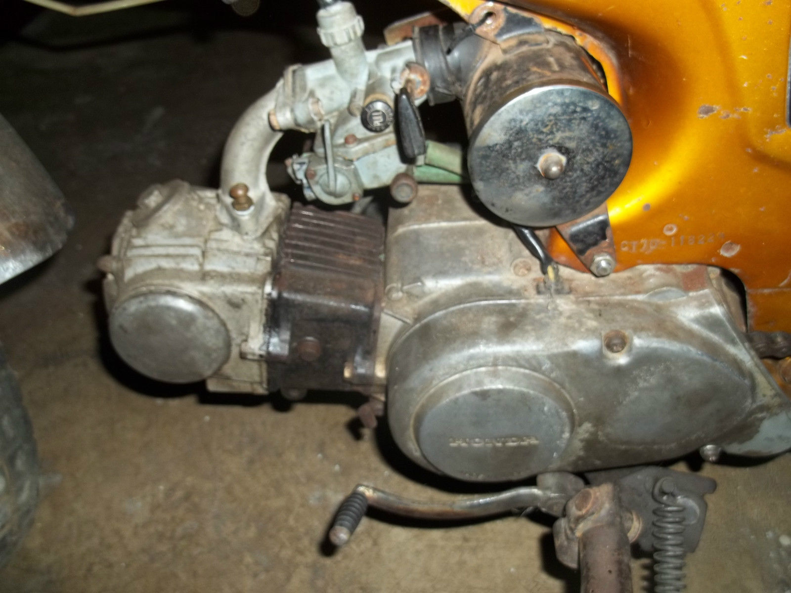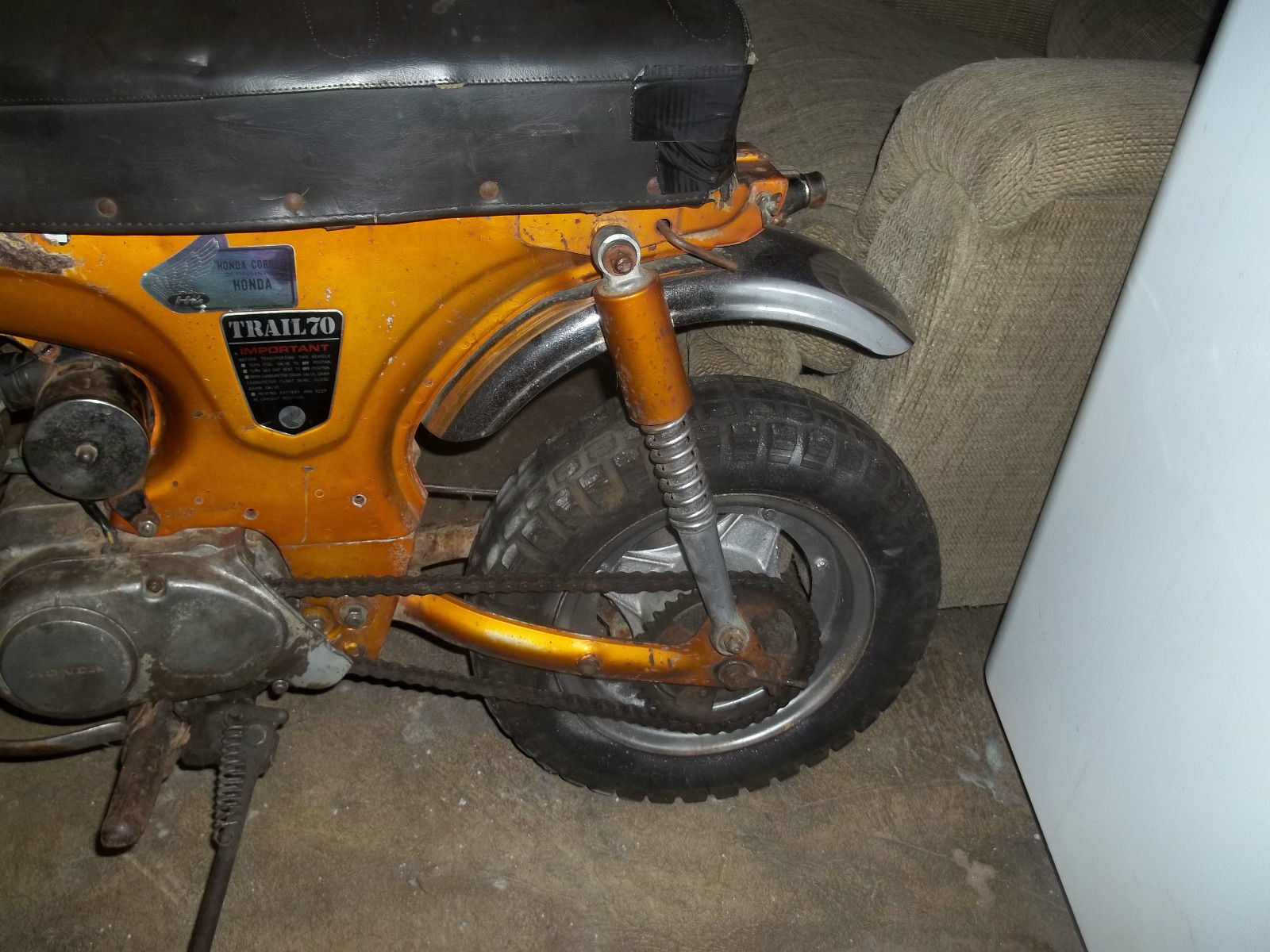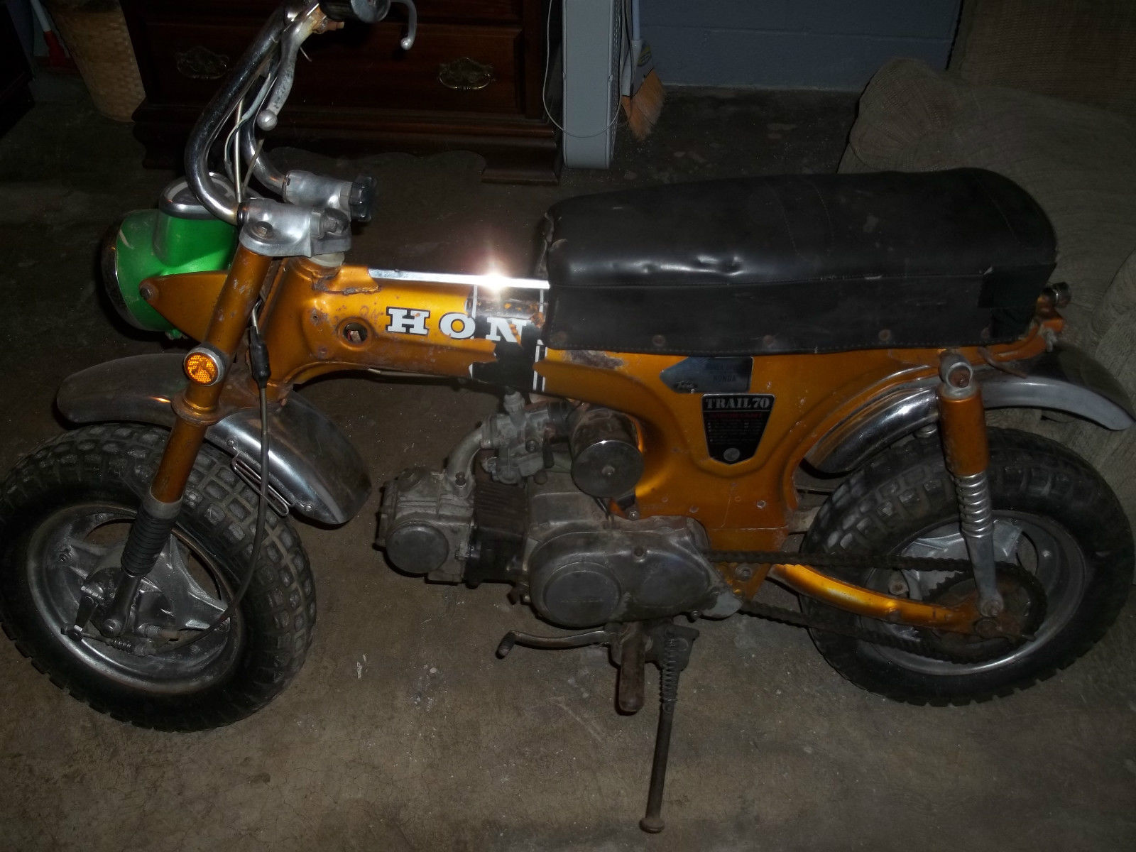 1971 Honda trail ct 70. Been sitting in my garage a while and I have no time to restore it. The bike is solid and in overall good shape for its age and the chrome looks to be good. straight handle bars with no bends. I don't think the seat is correct for this bike but it is comfortable and serves it purpose. As the photos show the bike needs cleaned up and maybe some new decals. The bad news is it don't run. The kick starter kicks but nothing happens. I don't know how to rebuild engines so I was going to just find another motor for it. There is a brake or clutch cable missing. I am selling this thing cheap but If you can repair the motor or even buy a new motor it will be worth what your paying . Again its solid . It also has a replacement light and od that is lime green. This bike is for pick up only. I will not ship. It will be up to the buyer to pick it up or make arrangements for shipping. I am flexible and will give the buyer up to 30 days to pick it up or arrange shipping. Payment is due Immediately after auction ending through PayPal. Please read all the descriptions carefully and look at the photos. This is a solid bike but needs work to make it run and I don't have a title . THIS IS A NON RUNNING BIKE and will require a rebuild or new motor. also no Ignition or key. Wiring sticking out Ignition hole and No battery. Sold as is for parts or fixer upper.