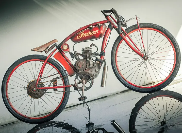 The bike we have here is our rendition of a Indian power plus Daytona. The color is a beautiful Indian red. with hand cracked under-base and countless hours of detailed airbrush finishing. All topped off with hand layered gold leaf script. The bike is fully functional and is powered by a 66cc two stroke motor. The bike runs great and will travel about 30MPH at around 80 MPG. The fuel tank on this bike will allow you to travel about 20 miles without refueling. Everything on the bike is steel or aluminum. all tig welded in house. Max rider weight is shy of 220lbs. our tallest guy in the shop is 6'3 and rides these around all the time. These are not built however to survive the apocalypse. Nor are they meant for racing (though we do all the time) These are just fun little powered bikes that are great for the pits. car shows. and neighborhood cruises. Park it outside the local Pub if you're feeling chatty. Just wildly fun affordable toys.
