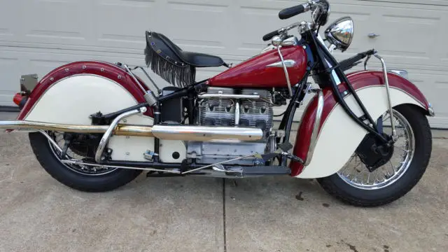 MOTORCYCLE HAS BEEN IN SAME FAMILY SINCE 1953 IT IS IN PRISTENE CONDITION WITH ONLY 14,639 ORIGINAL MILES WAS RESTORED ONCE BACK IN 1960 AND AGAIN APROX. 7 YEARS AGO BY MYSELF, T IS NOW PAINTED INDIAN RED & CREAM, IKE HAS NEW COKER TIRES & TUBES ON IT ALSO NEW BATTERY LAST YEAR RECENTLY REDONE BOTH GAS TANKS INSIDE WITH EPOXY 2 PART TANK BLADDER, LSO NE SPARK PLUGS AND NEW OIL IN MOTOR, IKE IS 100 % ORIGINAL EXCEPT FOR PAINT COLOR AND A FEW TASTEFULLY PLACED CHROME PIECES, FTER MY LAST RESTOR, PUT THE BLACK SOLO SEAT WITH ORIG. INDIAN LOGO ON IT ON BIKE AND LEFT SADDLE BAGS OFF I DO ALSO HAVE THEM AND MATCHING BIG SEAT, LSO NEW REAR CHAIN AND CARB. REBUILTALSO NEW FOOTBOARD RUBBER, BRAKE& CLUTCH & NEW INDIAN RUBBER GRIPSCAN SEND PICS OF SADDLE BAGS AND MATCHING BUDDY SEAT IF NEEDED THANKS FOE LOOKING