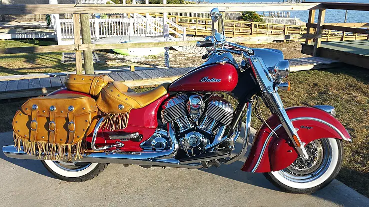 We added custom Indian rear-view mirrors. passenger footboards and roll bars. and a quick-release sissy bar and luggage rack. Â (The windshield and saddlebags are also standard Indian equipment and are quick-release so you can take this bike down to sleeker look in seconds. )Â All else is standard for the Indian Chief.