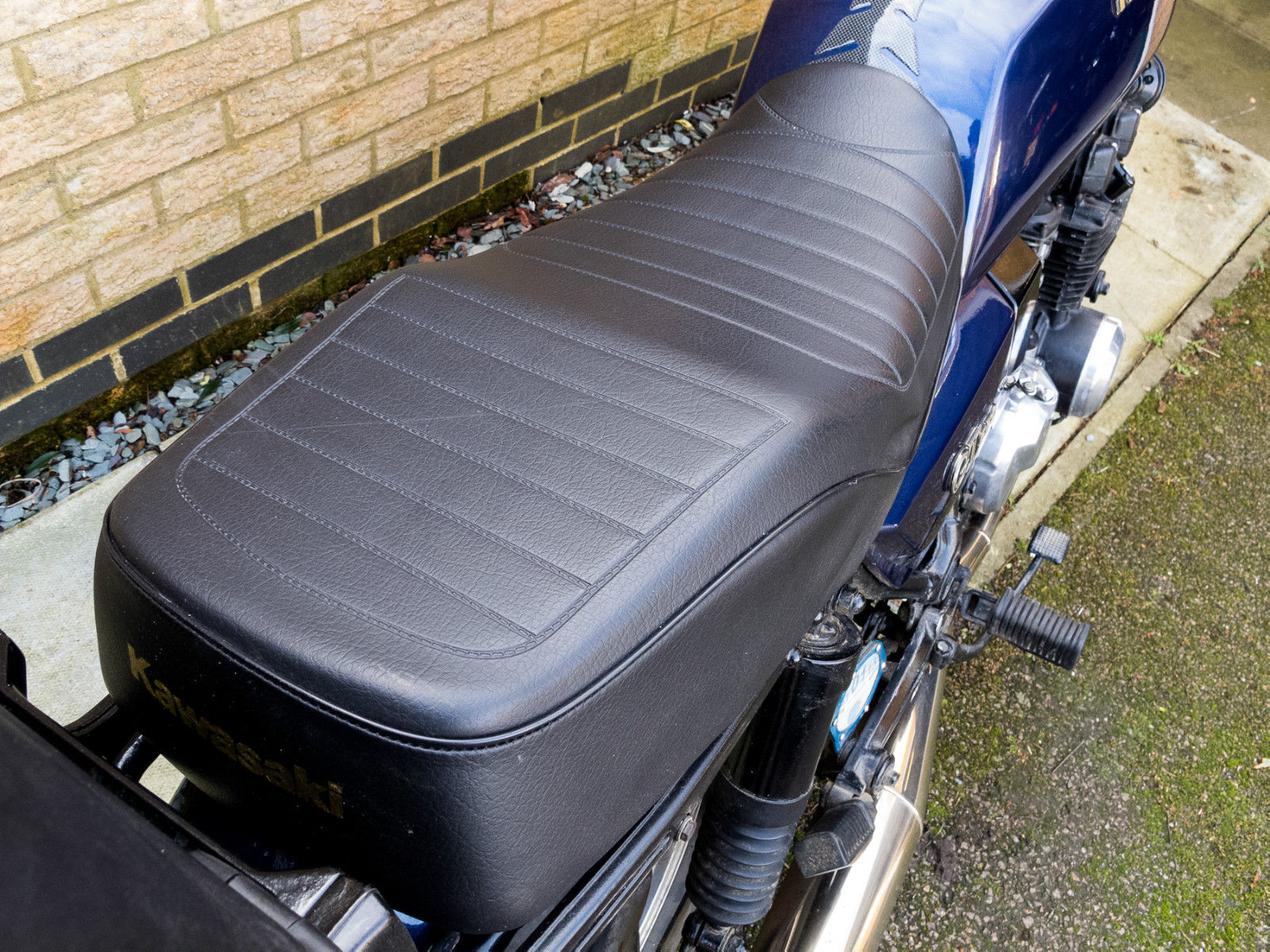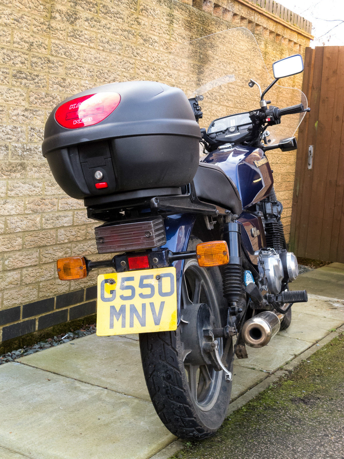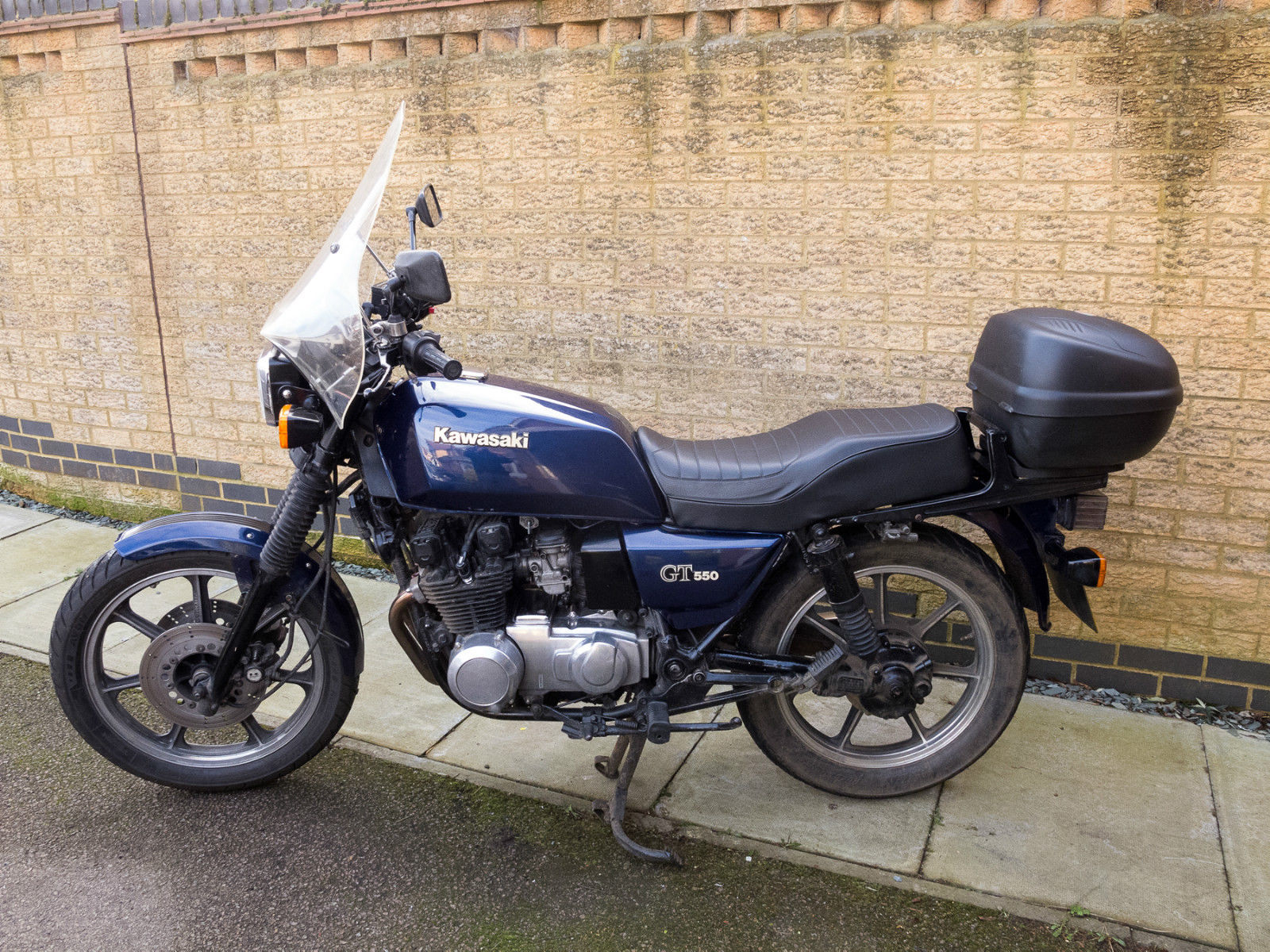 For sale is my Kawasaki GT 550 G4. first registered in January 1990. now a 25 year old Classic. It was originally registered in Northamptonshire and the dealer had the good sense to issue it with the number G550 MNV. I bought this about 18 months ago as a red. rusty wreck. having stood in a garage in Luton unused for 15 years as I wanted a winter project. No expense was spared. this was all done with the intention of keeping it. NOT selling it. and it is a lovely bike which I am now reluctantly selling due to emigrating! I have done 2000 miles on it in the past year with no problems. Here are some of the main things I did:-Replacement petrol tank/ sealed and all body work professionally sprayed metallic blue. Replacement carbs/ultrasonic cleaned and balanced. Tappets checked. all within limits. New front tyre with L shaped valve. rear good. plus extra spare rear wheel and good tyre. New front disks and pads. new front wheel bearingsNew Plugs/leads/plug caps/filter/oil/brake fluid/driveshaft oil. New Motad 4 into 1 exhaust. New Gel battery. New seat cover. Kappa K28 topbox (2 keys) and screenReplaced ignition switch and filler cap. same keys. fitted seat/helmet lock. seperate key. All electrics/suspension/engine in full working order. Lots of other parts replaced. Only 23136 miles. 12 months MOT (to Feb 2016)Taxed to end of Jan. will then be on sorn. Any questions. or to arrange viewing. call me on 07802954964. In Northampton. just off M1/J15A. Advertised elsewhere so reserve the right to cancel sale. CASH ON COLLECTION ONLY.