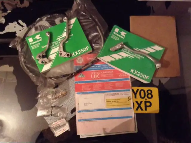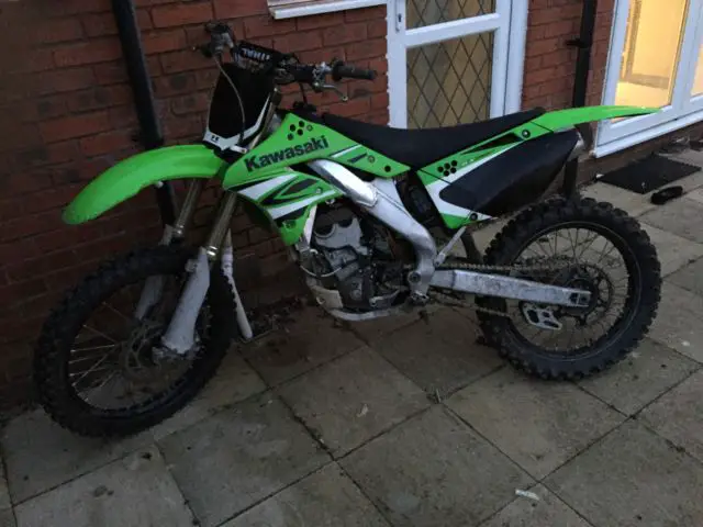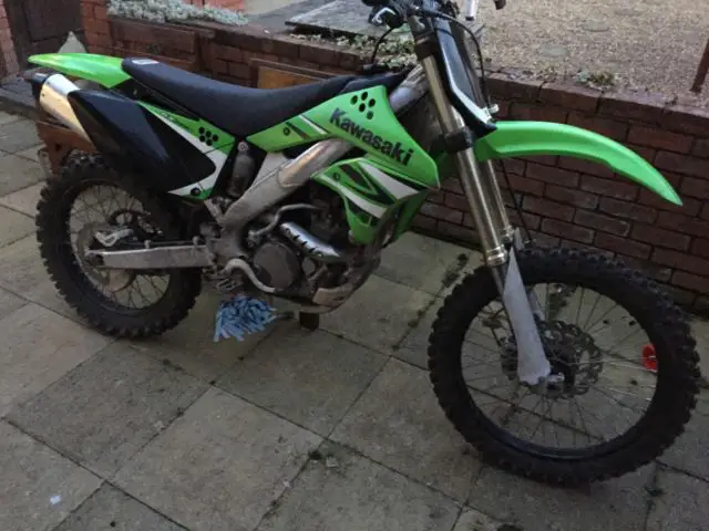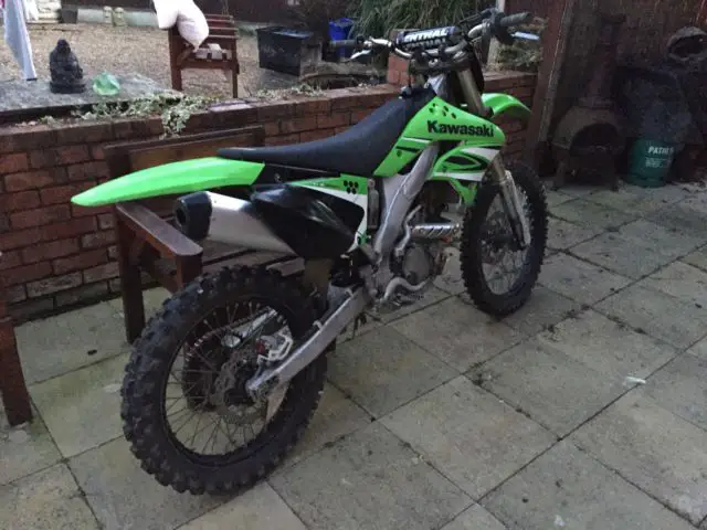 2008 08 KXF 250 Road Registered0 Previous owners I searched the internet for weeks before I bought this Only used it twiceI travelled to Ipswich to buy this 1 6 hour tripAs you can see its a original bike been well looked after It's had piston changes and services owner followed the Manuel Unfortunately I have no proof of this but if you see the pics the original Manuel's are with the bike spare jets plugs leavers cables and other partsBike is fitted with SnapBack leaversHas no tax or mot never used on road just came from the dealer road registered Tyres are good Bike comes as it should starts up every time ticks over smooth selects gears easy rides like a new bike I'm not in no rush to sell as I no it's a good bike You can ride it 30mins/1hr turn it off and starts off 1 kick no valve or shims problems like the rest Would be ideal for green laneing or practice weekends Viewers welcome but please ring a day before as bike is kept at work I will clean it for the new owner Any questions please call 07469879357Happy Bidding No reserve Any bidder with less then 10 feedback your bid will be removedAdvertised elsewhere Delivery available