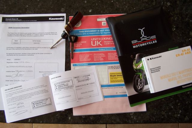 I have Log Book. Two Keys. Service Book and A2 Licence Certificate. /p>