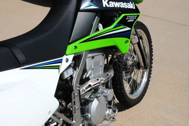 Engine - Four-stroke, iquid-Cooled, OHC, our-valve singleDisplacement - 249ccBore x Stroke - 72.0 x 61.2mmCompression ratio - 11.0:1Carburetion Keihin - CVK34Ignition Digital - CDITransmission - Six-speedFinal Drive - ChainPerformanceFront Suspension / Wheel Travel - 43mm inverted cartridge fork with 16-way compression damping adjustment / 10.0 inRear Suspension / Wheel Travel - Uni-Trak® with adjustable preload, 6-way compression and rebound damping adjustment / 9.1 inFront Tire - 80/100x21Rear Tire - 100/100x18Front Brakes - 250mm semi-floating petal disc with two-piston hydraulic caliperRear Brakes - 240mm petal disc with single-piston hydraulic caliperCooling System - Liquid