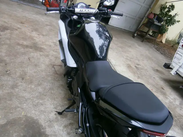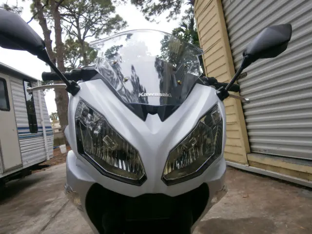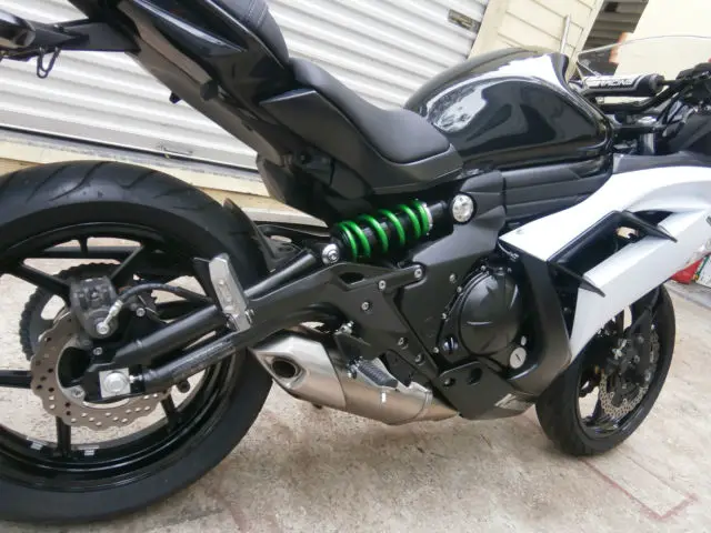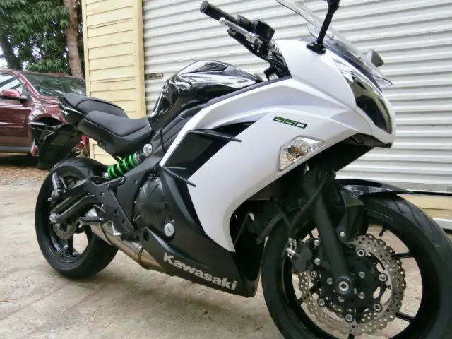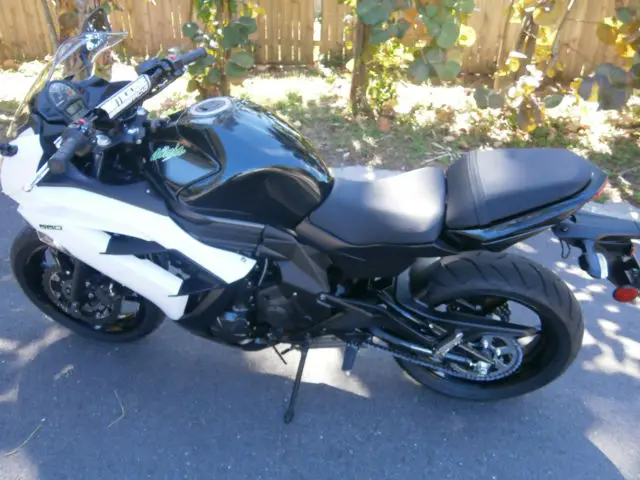 this is a very clean nearly showroom ex 650 Kawasaki ninja black sparkle/white pearl combo. runs and sounds perfect. there is absolutely nothing wrong with this bike. It has just been rebuilt and then inspected by the state of Florida an issued a Florida rebuilt title. the items that were replaced on the bike were the fairing, headlight, ront forks,handlebars and front wheel. when title was issued miles were 842 miles but because the bike was rebuilt the mileage was listed as not actual, owever I believe this to be true.Again this bike is nearly show room there are a few scratches on the right side of the fairing but other than that this is a very clean machine and can be had for a good price, he scratches can be seen in one of the photos and are of the right white fairing, ill include in price color matched color rite base & topcoat touch up pens thanks for looking and watch the video of it running. will help in shipping to assist your shipper, ill deliver in Florida for a fee.