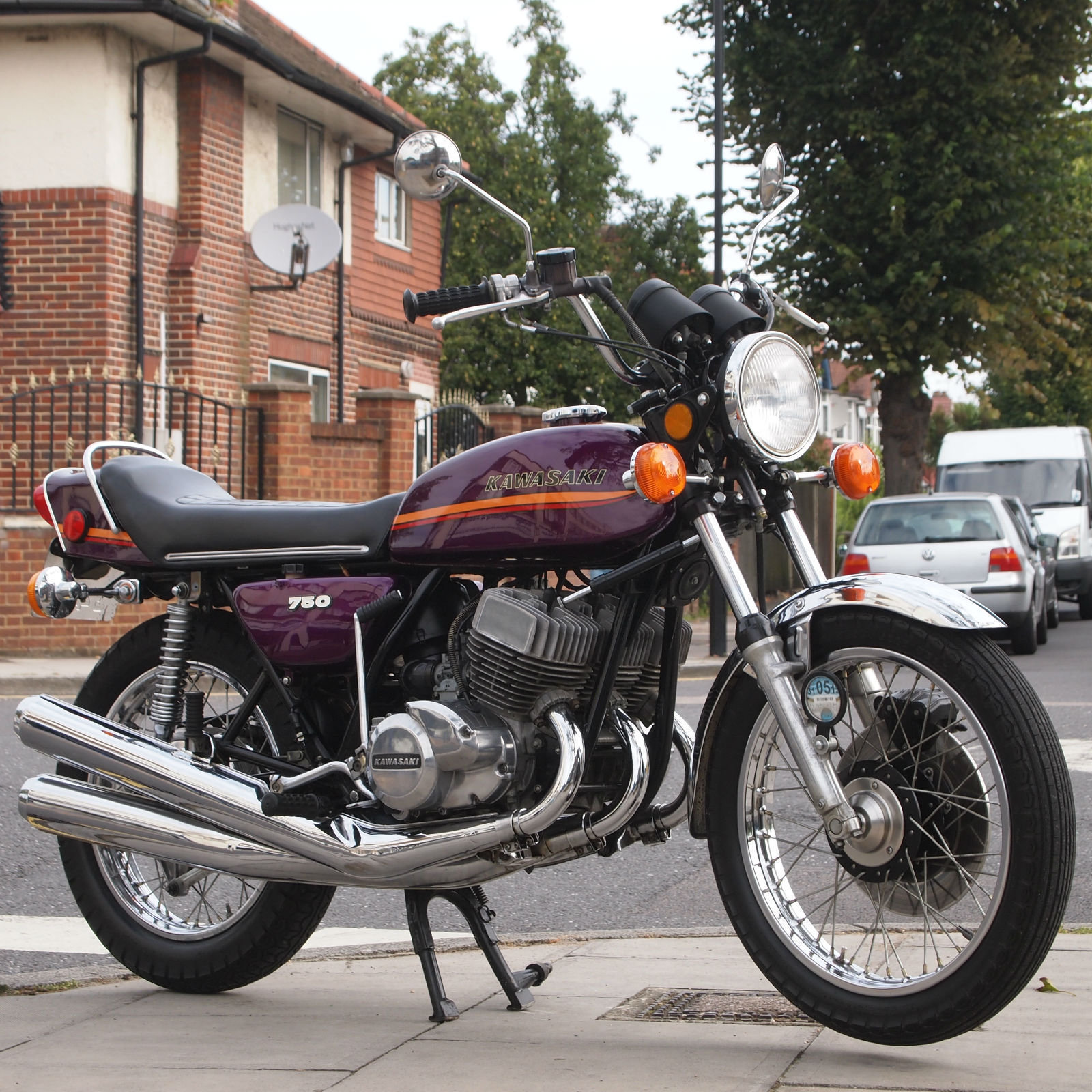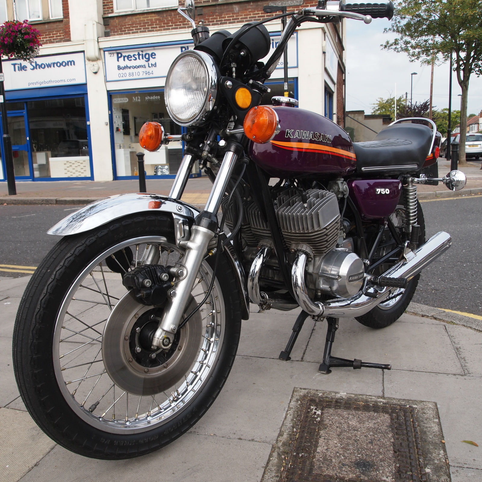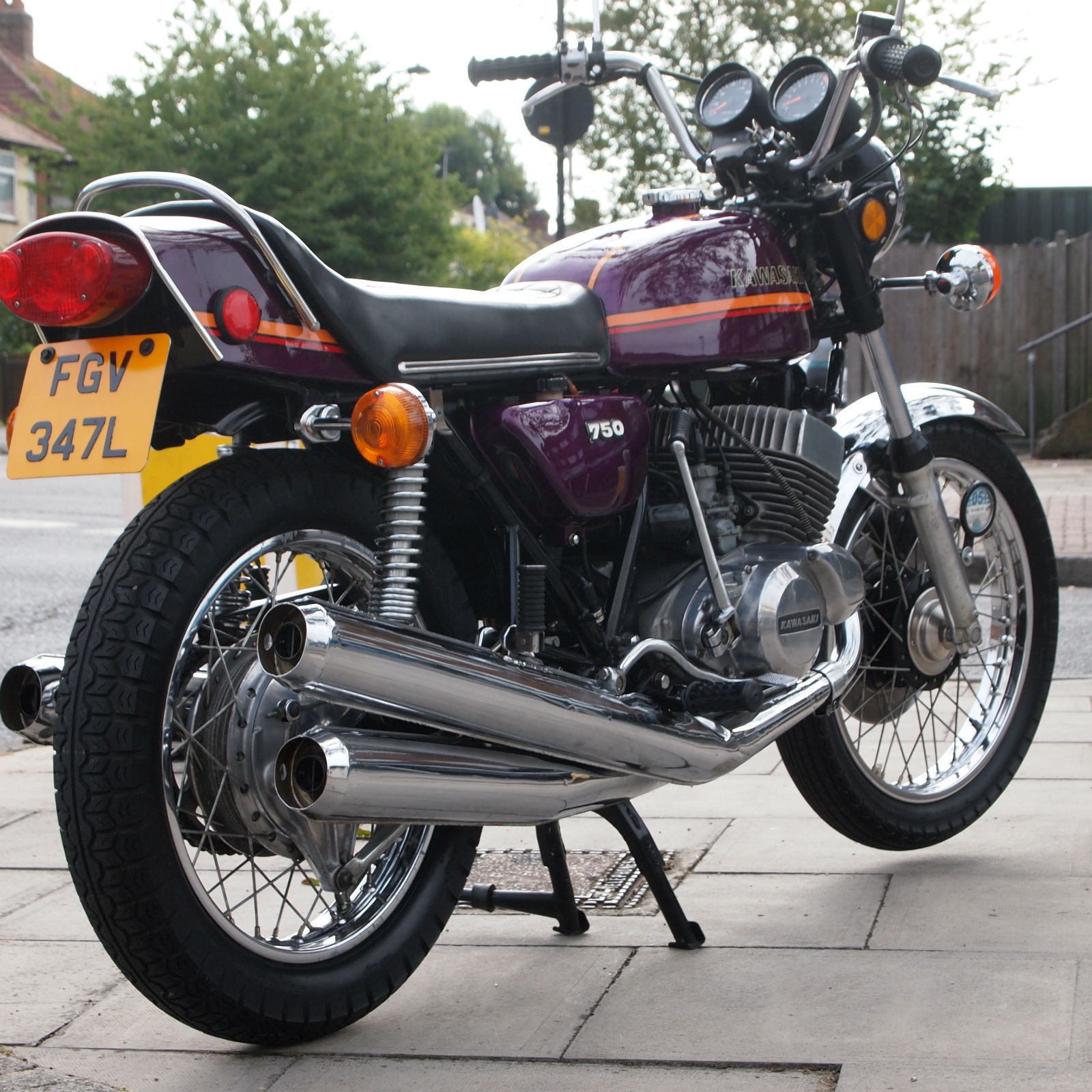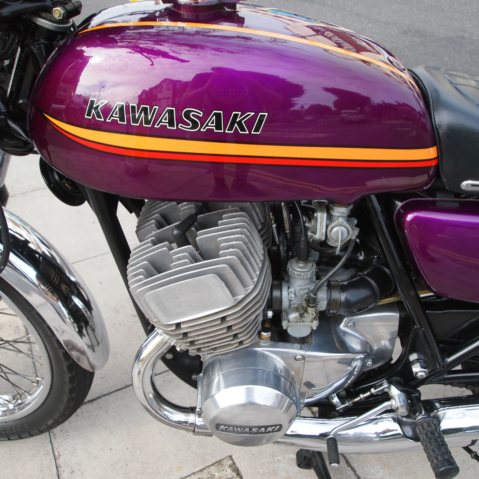 ( THIS BIKE IS A MUST HAVE FOR THE SERIOUS H2 ENTHUSIASTE. THE MACHINE IS TOTALLY ORIGINAL AND UNMOLESTED AND HAS A VERY VERY NICE PATINA LOOK ) Year of manufactuer 1973 L Reg: and date of first registered was on 31. 01. 1973 in the USA. Frame No: H2F31978 and Engine No: H2E32021 which are 43 apart which is correct as when the bike left the Kawasaki factory in 73. Everthing is original from the paint to the stickers to the unopened toolkit and spark plug holder and even still has the original front tyre WHOOPS. The bike starts first prod of the kickstart and rides as it should with the feel of a new bike due to its low milege. WOW what a find i can only presume its been stored in a Texas dry barn / house for all these years. Condition must be seen in the flesh and if you want to pick faults then the only one is a small dent near the groin area of the fuel tank where someone has dropped an object ?. The bike has been in the UK since 2008 and is fully registered on an age related number plate and is know eligible to be classed as a Historic vehicle hence free road tax each year. From what we can see on the paperwork the bike has had three former keepers from new and comes with both keys. Tax and Mot are until mid 2015. part exchange would be most welcome. All payments accepted. Delivery can be arranged anywhere in the UK / World for a fee. Please feel free to call or email us with your interest in this one off find. Call the shop / showroom on 020 8997 2421 most days between 9 and 5 or you can try my 24/7 anytime within reason mobile on 07973 11 12 13 just ask for Frank. THANKS FOR LOOKING.