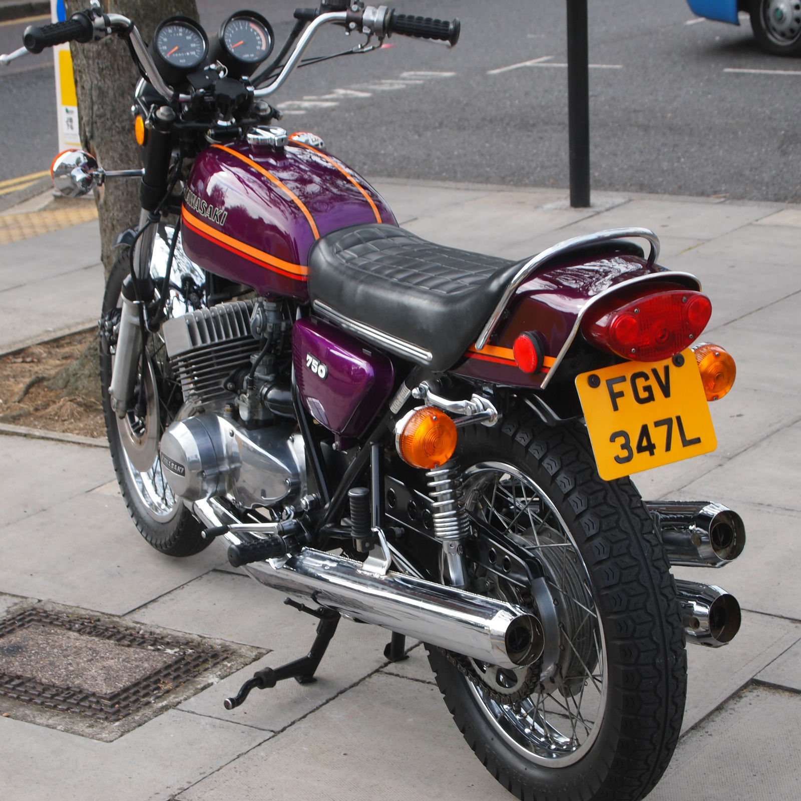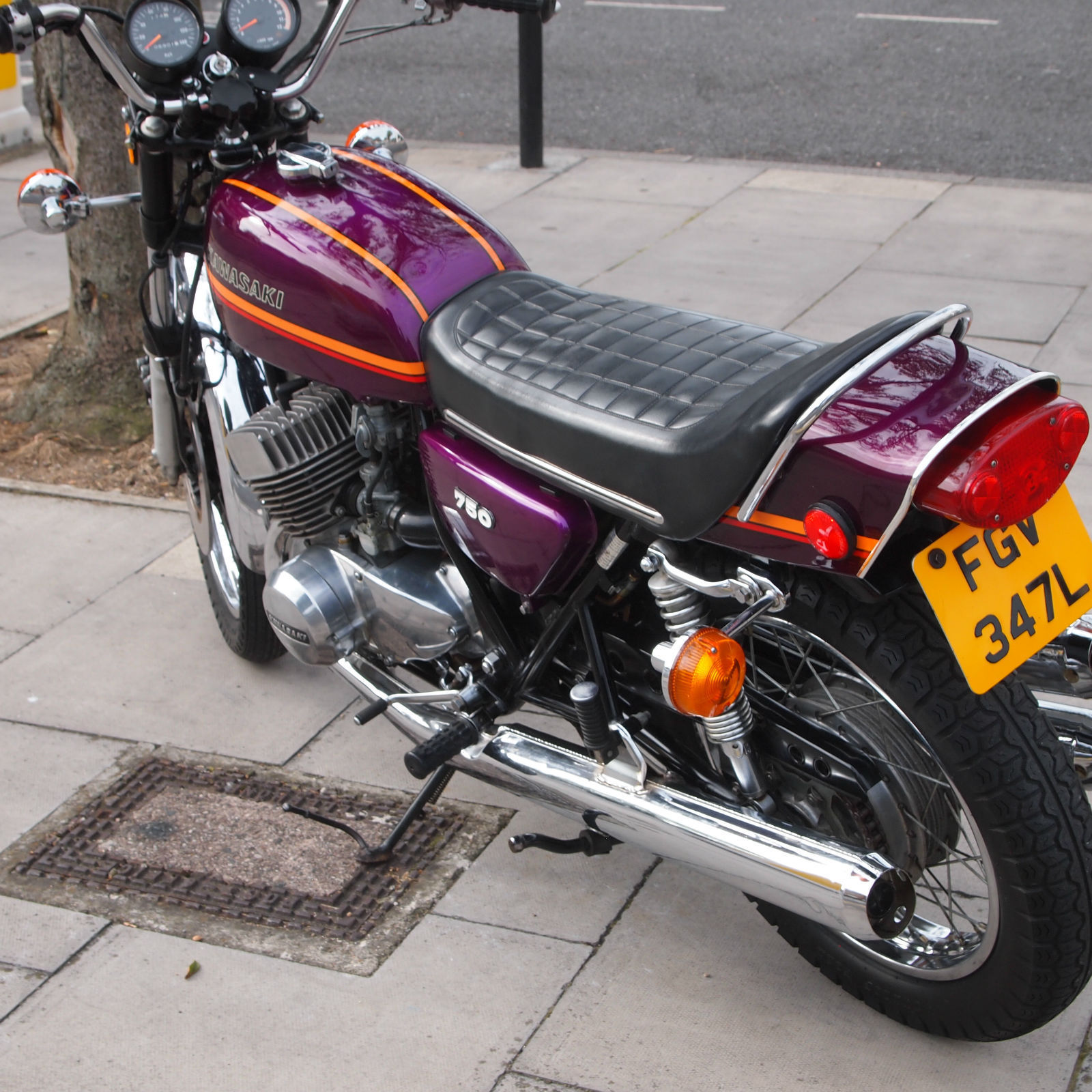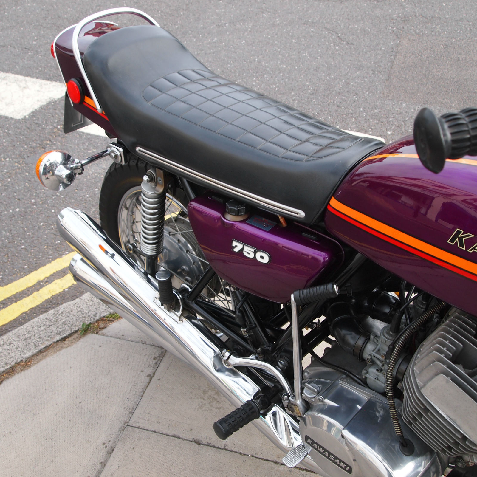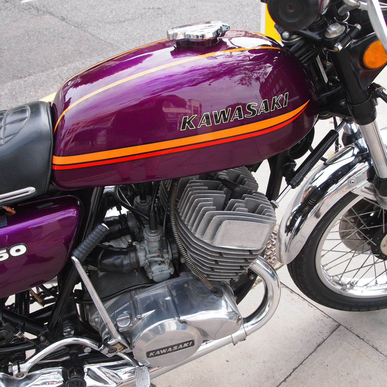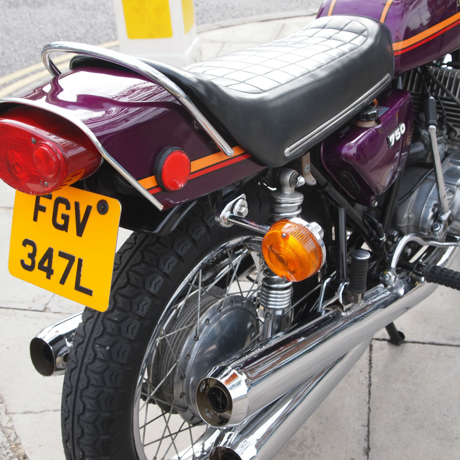 ( THIS BIKE IS A MUST HAVE FOR THE SERIOUS H2 ENTHUSIASTE. THE MACHINE IS TOTALLY ORIGINAL AND UNMOLESTED AND HAS A VERY VERY NICE PATINA LOOK ) Year of manufactuer 1973 L Reg: and date of first registered was on 31. 01. 1973 in the USA. Frame No: H2F31978 and Engine No: H2E32021 which are 43 apart which is correct as when the bike left the Kawasaki factory in 73. Everthing is original from the paint to the stickers to the unopened toolkit and spark plug holder and even still has the original front tyre WHOOPS. The bike starts first prod of the kickstart and rides as it should with the feel of a new bike due to its low milege. WOW what a find i can only presume its been stored in a Texas dry barn / house for all these years. Condition must be seen in the flesh and if you want to pick faults then the only one is a small dent near the groin area of the fuel tank where someone has dropped an object ?. The bike has been in the UK since 2008 and is fully registered on an age related number plate and is know eligible to be classed as a Historic vehicle hence free road tax each year. From what we can see on the paperwork the bike has had three former keepers from new and comes with both keys. Tax and Mot are until mid 2015. part exchange would be most welcome. All payments accepted. Delivery can be arranged anywhere in the UK / World for a fee. Please feel free to call or email us with your interest in this one off find. Call the shop / showroom on 020 8997 2421 most days between 9 and 5 or you can try my 24/7 anytime within reason mobile on 07973 11 12 13 just ask for Frank. THANKS FOR LOOKING.