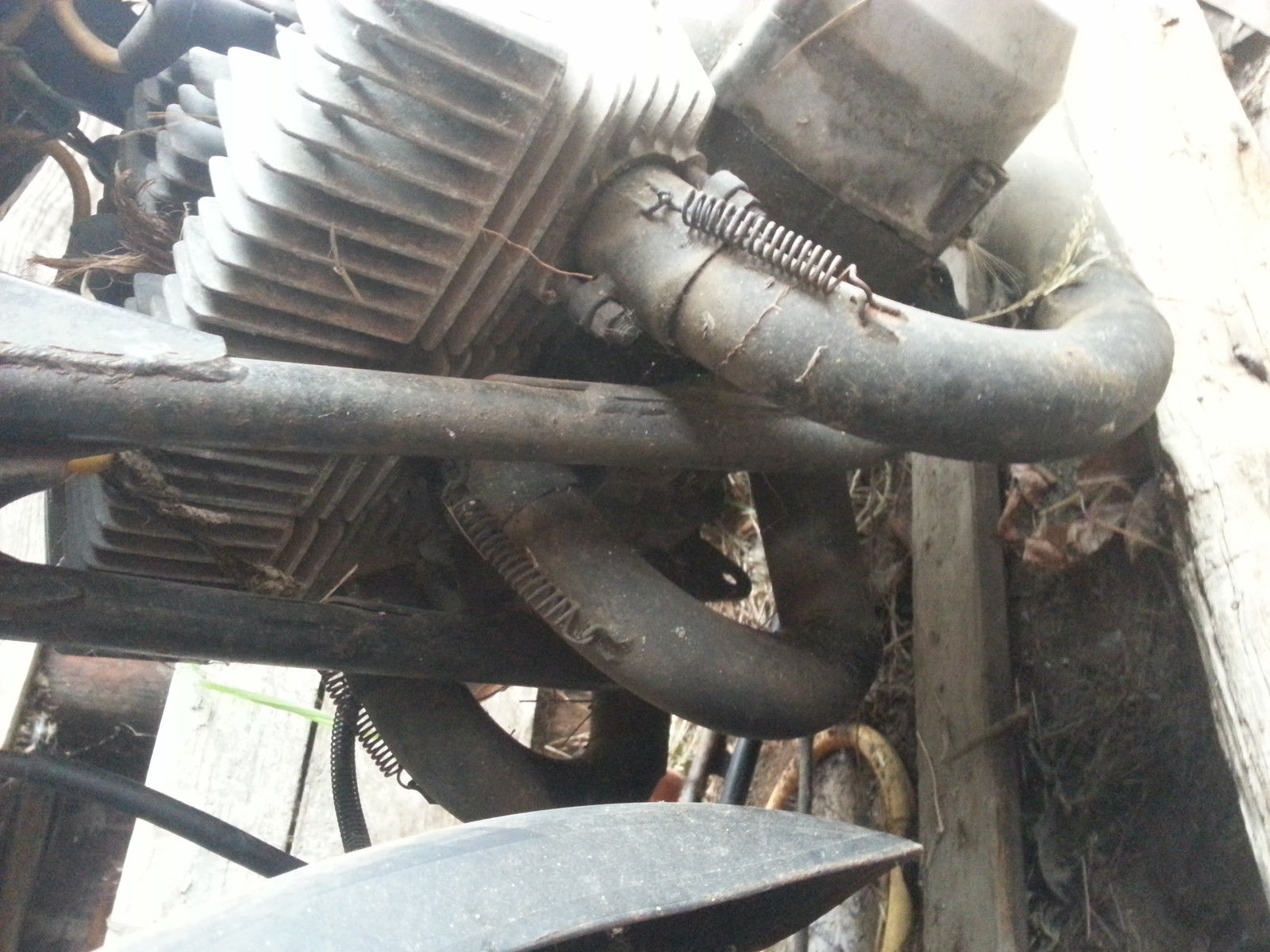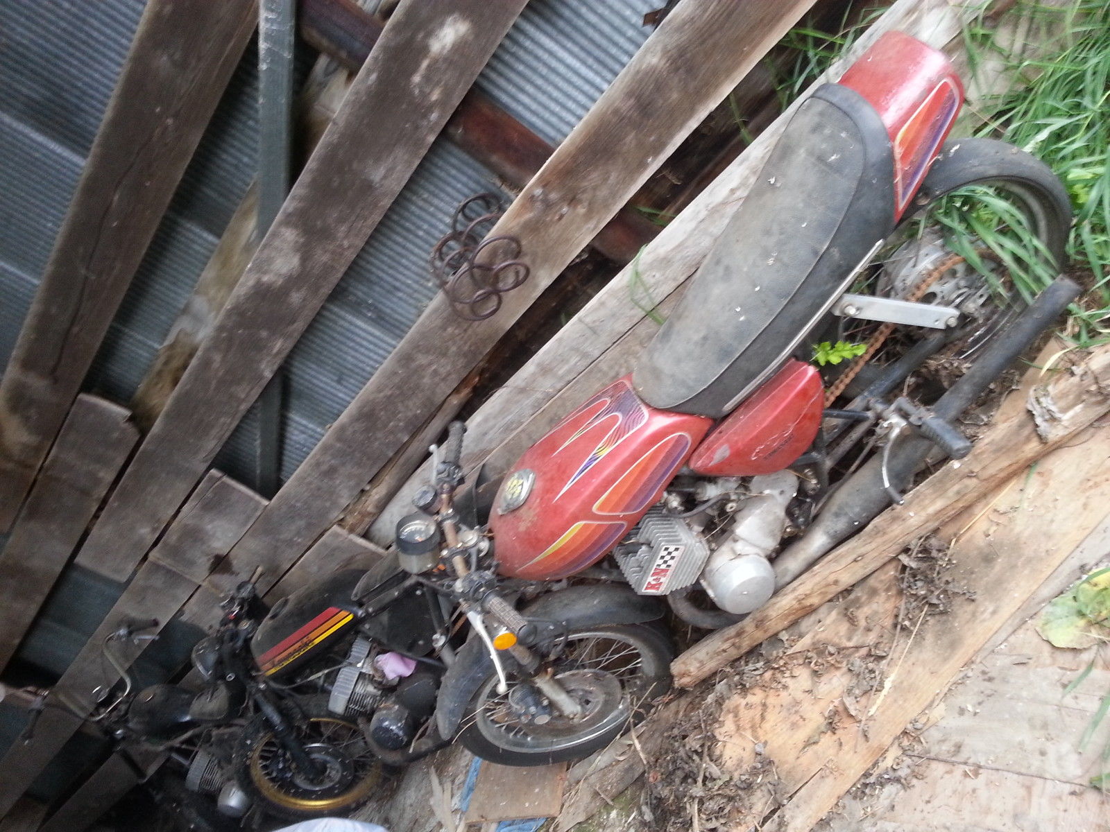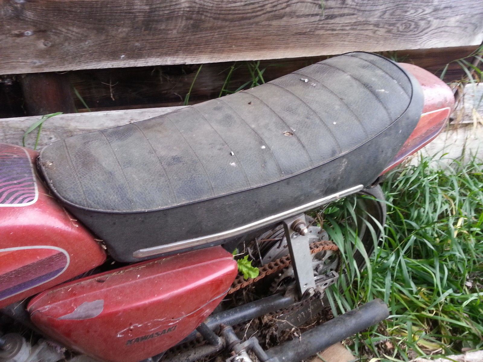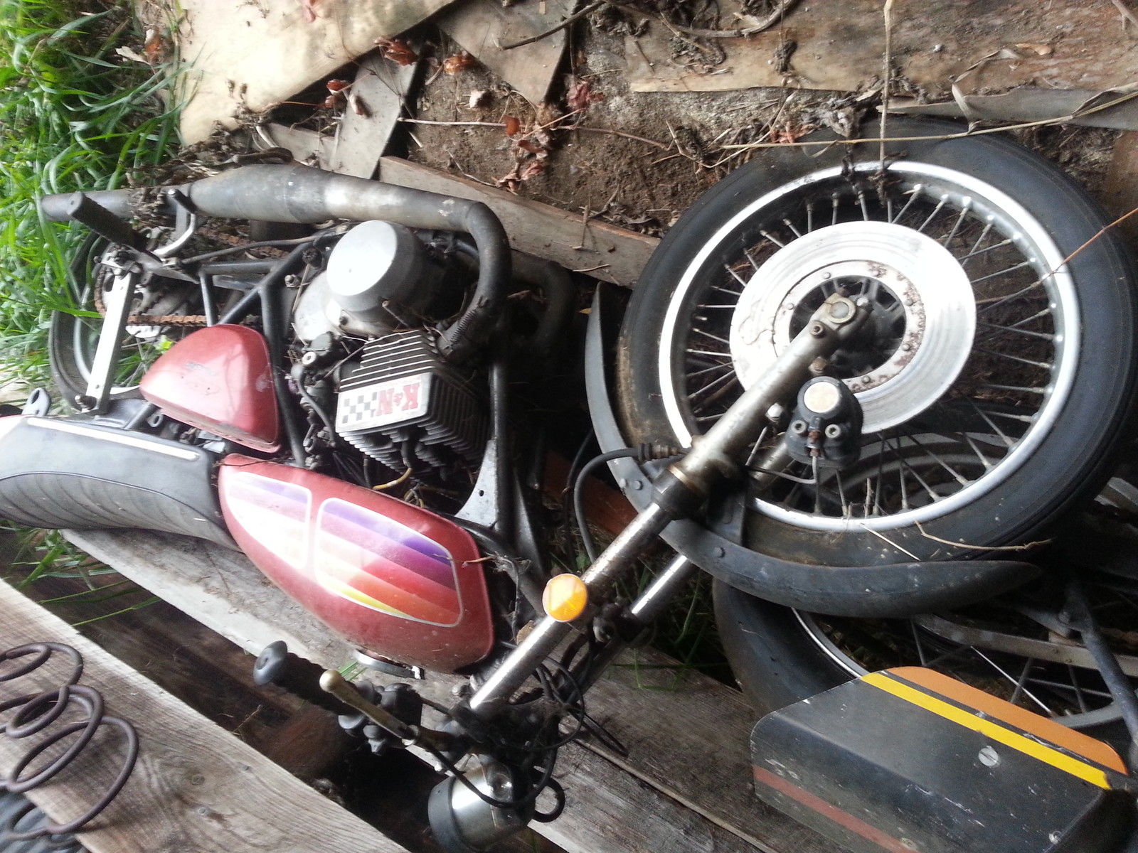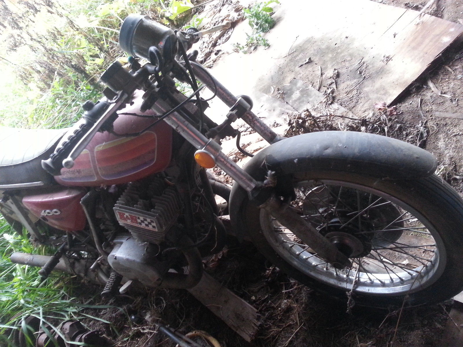 Hey everyone - here you go - a real cool old barn find! When's the last time you saw one of these Kawasaki 2 stroke triple drag bikes? The older brothers of this bike ruled the streets back in the day! You remember the H1 and H2 Kawasaki's. don't ya? Well this bike is the little brother of those bad motor scooters - the Kawasaki S3 400cc! This is a hard running little vintage drag bike capable of lo 12's/hi 11's. depending on the weight/skill of the rider. It is equipped with expansion chamber drag headers. wheelie bars. and a full race 400 that sounds like an angry hornet's nest on nitro - you've got to hear this bike run! I did for a few seconds after the previous owner started it and then sucked nasty. varnishy gas up into the carbs and stalled it. so they need to be cleaned up or rebuilt!! You may get away with just soaking/blowing them out. Just think - you'll be unique at the drags the next time you show up with this lil' lo buck scooter! And dig the total 70's vibe. will need some tlc/cleaning. and especially new tires - but hey - she's BARNFRESH!