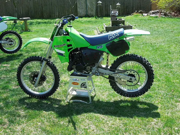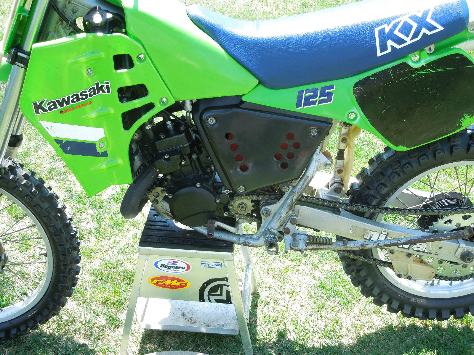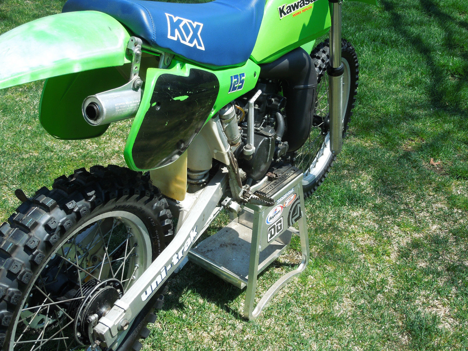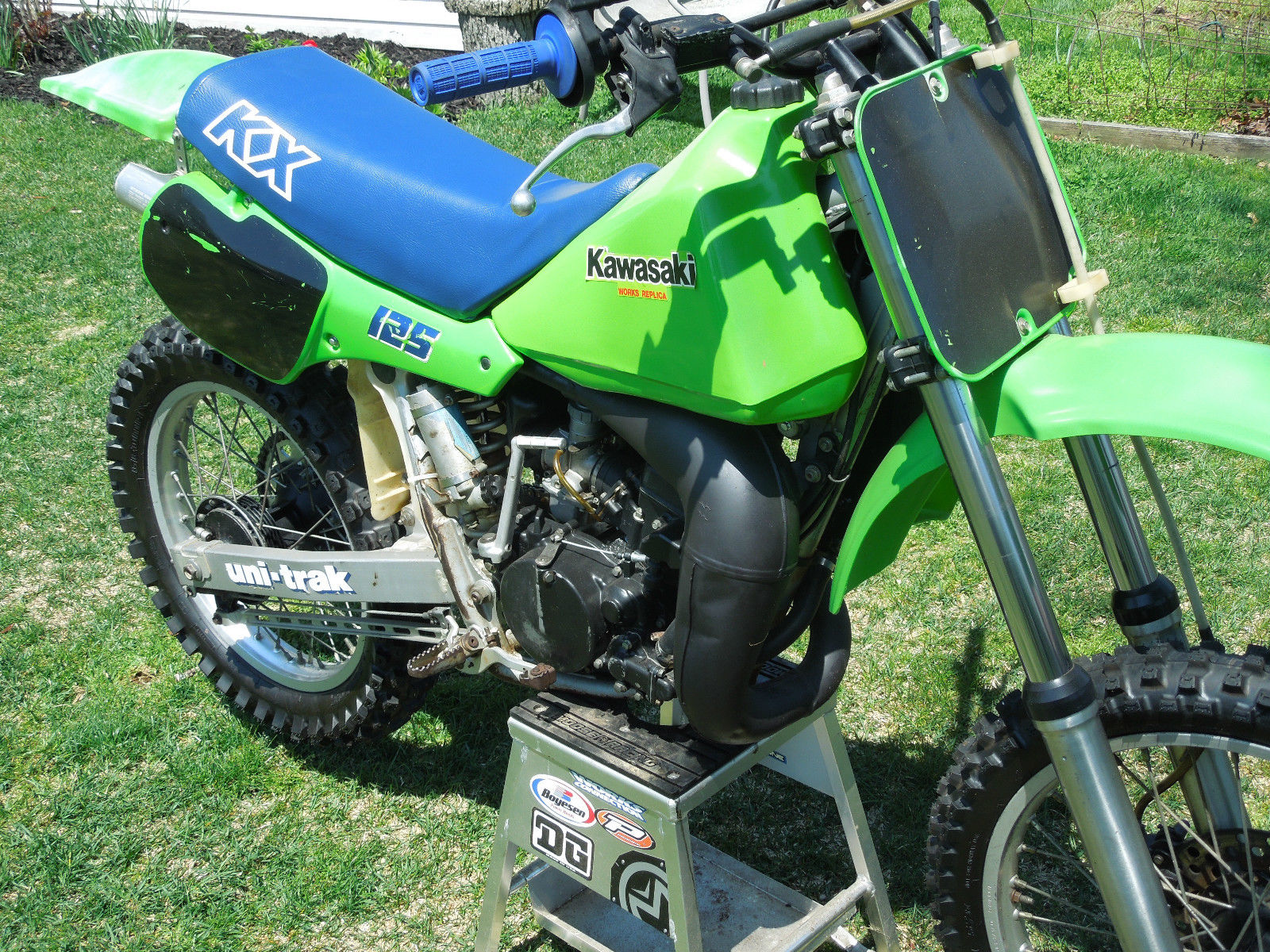 Kawasaki KX 125 in good condition and good working order. Selling with all equipment shown (trousers 2 pair. jacket. body armour. shirt and assorted oils. ). I have lost storage for the bike plus I havnt used it for over two years so I have decided to sell it. Drained and changed the petrol and cleaned the carb and the bike is now running well. Engine has been tuned new seat fitted nice clean tidy bike also has two stands. Any questions please email. Could deliver depending on distance for a small fee.