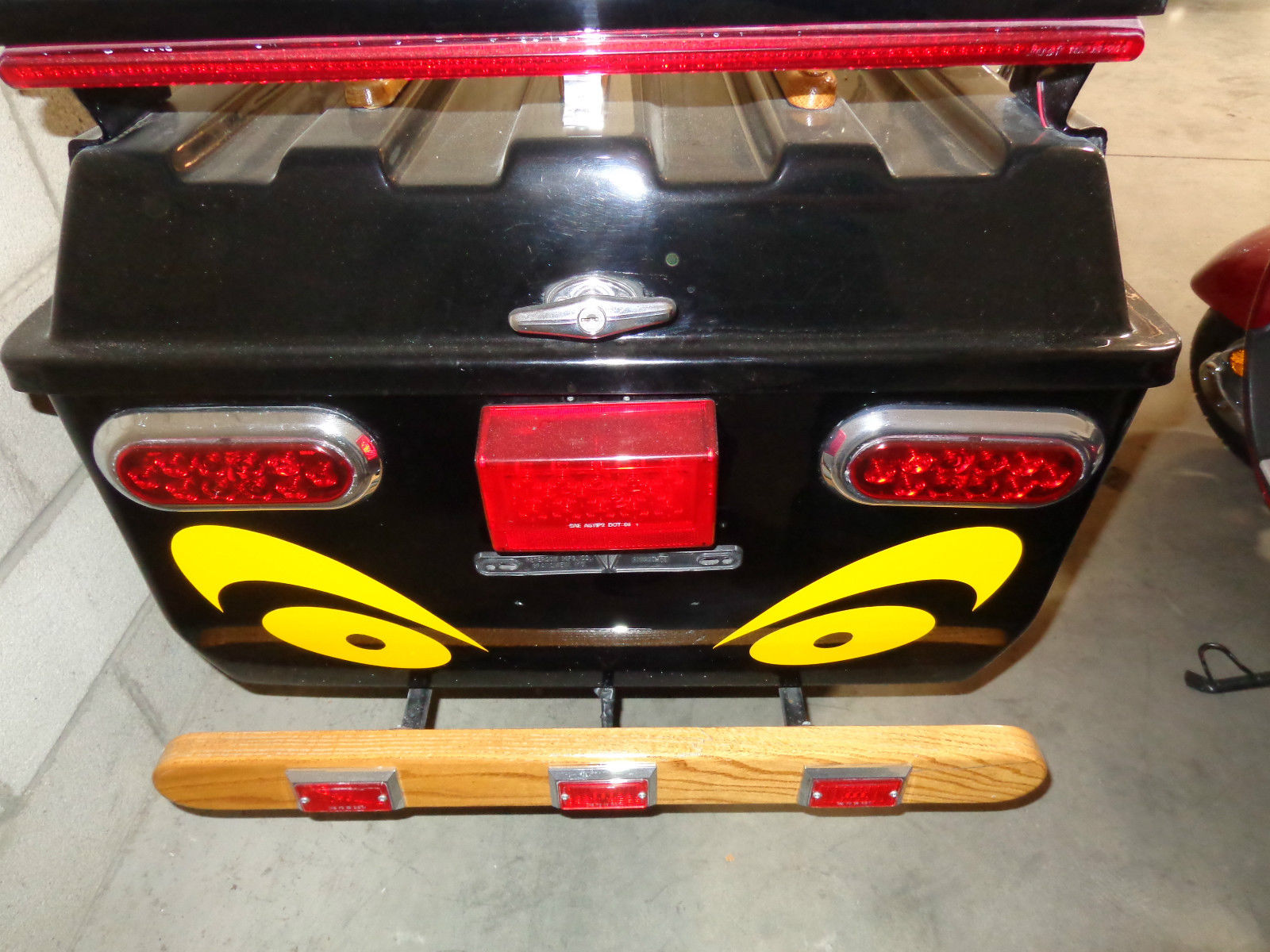 9. Tow-Behind Trailer - Starlight. nbsp;(about 25-cubic feet storage). chrome rims. spare tire. cooler fixed to front forks. custom rack. solid oak support ribs. etc. . SWIVEL TOW HITCH - DOESN'T BIND UP WHEN CORNERING !!