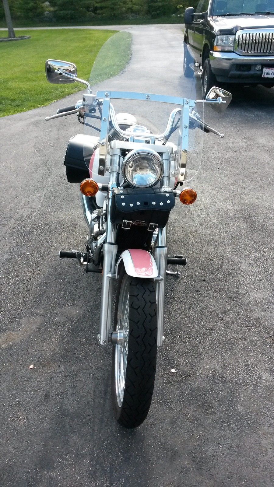 Two toned pink/pearl 2009 Kawasaki 500 Valcon bought brand new in 2010. Â Accessories added are saddle bags. front fork bag and a quick release windshield. Â Paint job is a custom two tone paint (pink/pearl). Â Bike only has 90 miles. Â Was purchased by my wife but she found other interest in the equine industry. so biking has turned out not to be her gig. PLEASE NOTE: Â I live in London. OH. Â If you win this auction you will be responsible for figuring out transportation from me to you and paying for all transport costs. Â I am not responsible for any of that. Although I will try to help you in anyway that I can that is reasonable.