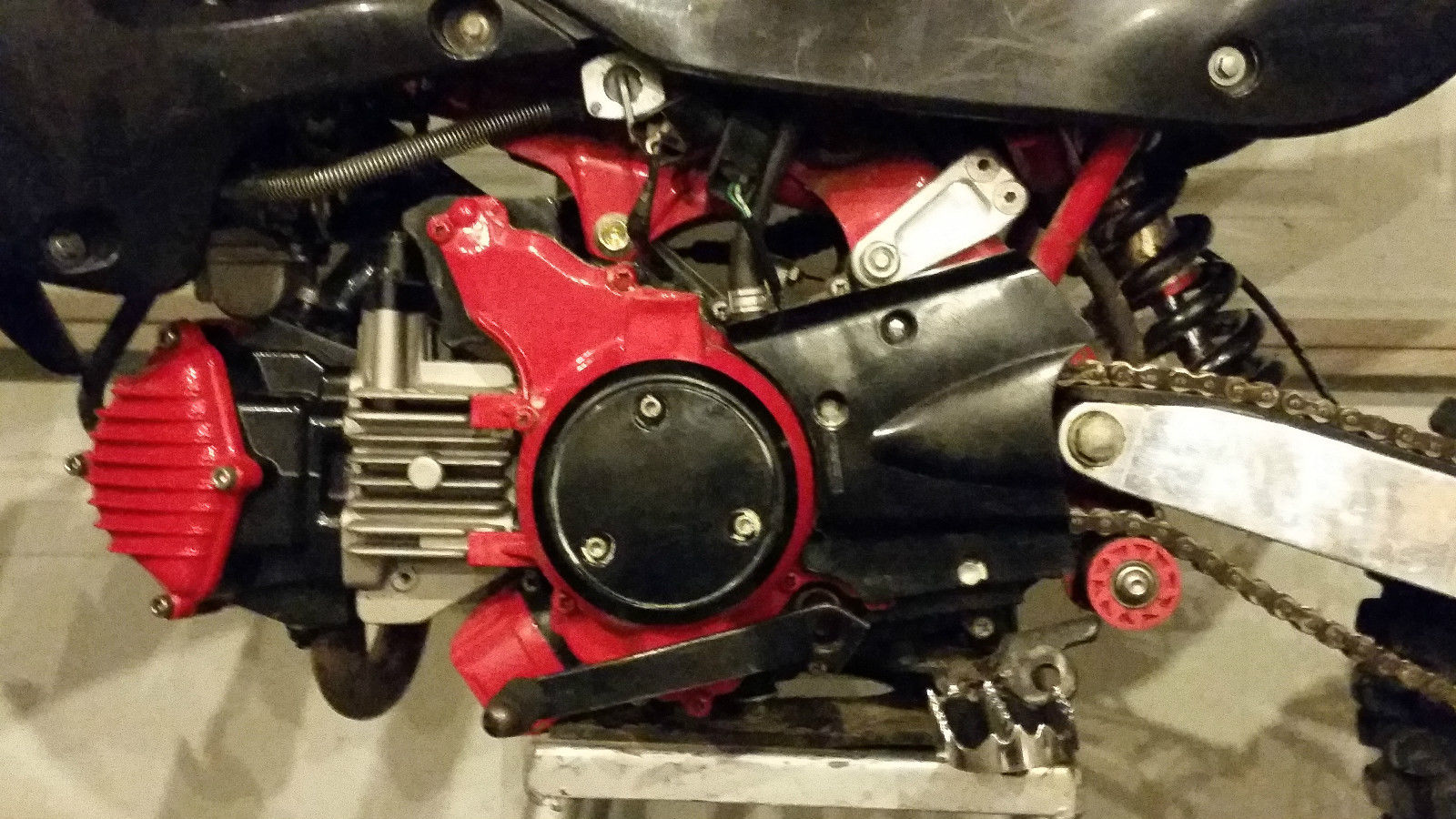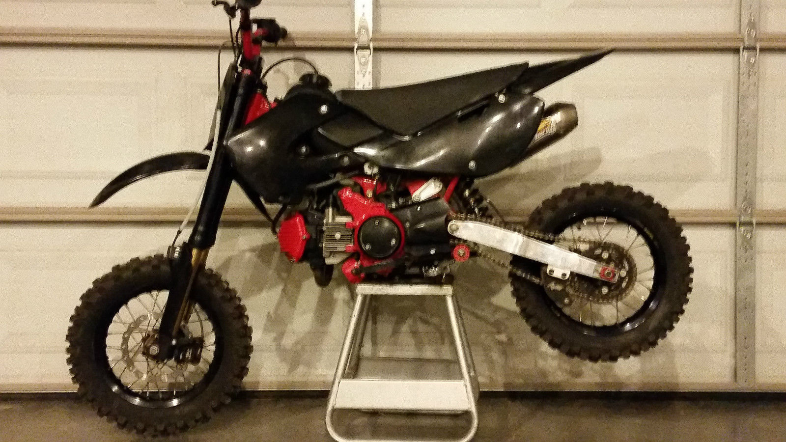 Every part on the bike is aftermarket. $8000 was spent in parts to turn it into what it is today. It does not have a vin number obviously because the frame is aftermarket. It has an aftermarket water-cooled radiator. custom built mx ready powder coated engine and frame. Scott grips. Hayes mx brake lever. Marzocchi forks and triple clamp. TB parts carburator and air filter. BBR big bore kit. Factory Effex tall seat foam and seat cover. new black plastics. FMF Factory 4. 1 exhaust. TB parts wide foot pegs. Fox racing rear shock. Haynes mx front disk brake kit. Formula rear disk brake kit. Reeg mx swing arm and chain guard. DID sprockets and chain. full 12" excel rim in the rear and full 12" Faba rim in the front. It has a four speed manual transmission with clutch(stock klx 110's do not have manual transmission) and the gearing is neutral down four up. The Bike has tons of power. ready for mx or whatever you would like. Its great for foolin' around on the street and will ride a wheelie for as long as you can handle it. but its not for beginners. Because of the big bore kit bike runs on 100 octane fuel only! You will burn up the motor if you use anything less. Bike will go 60-70 (depending on how heavy you are) mph down the road and is as loud if not more loud than most 250's with FMF pipes.