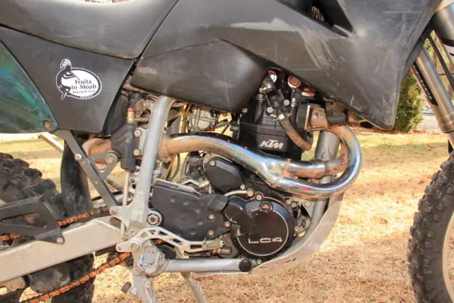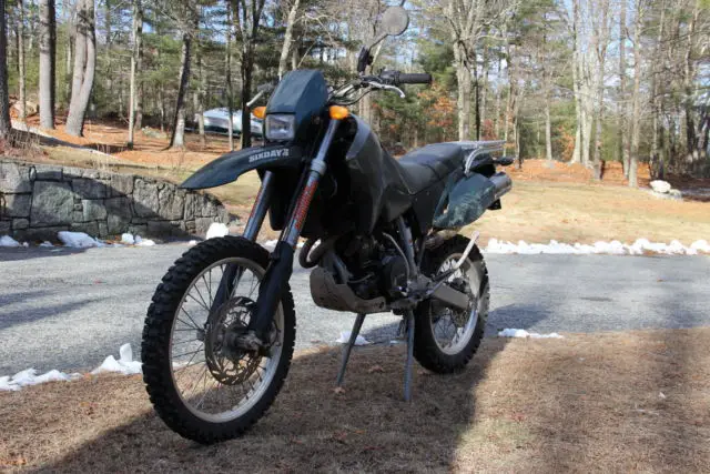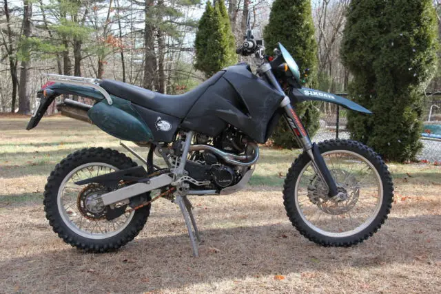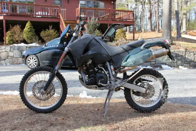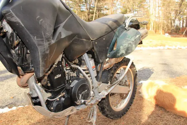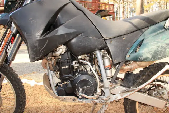 Title in hand. 2002 KTM 640 LC4-E Six Days Edition with 11. 00 miles. I had Cliff's Cycles change out my stock carb to an FCR 39. New chain and sprockets about 1k miles ago. bike is geared for woods riding but is too big for me so I'm selling it for a 2 stroke dirt bike. Bike was worked on and maintained over the last 5 years by Cliff's Cycles and just had a major service. It had the main shaft seal/bearing replaced which is a common problem on the pre'2003 bikes. They went through everything due to a problem with the valves. they took the head off and sent it out to be remachined. put all new valves in. buttoned it all back up and it is ready to ride. I have ridden less than one mile since picking it up at the shop and it won't get ridden anymore until the new owner rides it. They replaced the steering bearing. wheel bearings. put new cables on the bike. recent brake pads front and rear. adjusted carb. new fork seals. shift lever. brake lever etc. They went through everything. bike is completely ready to ride and take you anywhere. I had Cliff's change out my odometer for a Vapor Trail Tech at about 8500 miles or so. Also I had suspension rebuilt and revalved for my weight of 175 by Factory Connection Suspension in NH last year. The bike has normal cosmetic problems for a 14 year old bike. The plastics are scratched. the aftermarket 5 gallon tank is scratched. but I do have the original tank and plastics that are in good shape. It is not a show bike but if you are familiar with the LC4's then you know what this bike is meant for. I took it to Moab and did the Transamerica Trail with it. other than that. it sat a lot and didn't get much use. I bought it from a good friend of mine who I still ride with and I would be very comfortable selling it to another good friend. This bike should last a very long time. I also have extras that come with the bike. like the KTM tall seat. spare oil and air filters. almost new rear tire. extra cables and miscellaneous "stuff". Also have the service manual in addition to all owners manuals. See pictures for more details. and email any questions. I could talk for hours about this bike. so please email me your phone number and we can talk details. A few other details I can think of. I installed the Vapor Trail Tech Computer (actually Cliff's Cycles did everything except that fancy mounting job you see. I did that). I also installed a cigarette lighter for a phone charger. ugly but it works-and easy to remove if you don't want it. Doubletake mirror on the left side. I still have both stock mirror. the left one stripped out but I believe the right one screws in fine. but I can't say for sure. I've had the RAM ball on the right for a long time now. and used another double take on that. ***Odometer: The main reason I installed the trail tech vapor was because my odometer cable broke. This happened along the TAT. I marked it in my GPS when I noticed it was no longer working. I had about 1. 00 miles of riding left at this point. Unfortunately. since then. I really haven't put many miles on the bike. It has between 11k-12k miles on it. and 12k is absolutely a stretch. I guarantee it does not have 12k miles on it. Notice in the pics. the damage to the case cover from going down on the left side. and bending my shift lever (hence the new one). The case cover is actually slightly dented although hard to see in the pics. I told Cliff's to replace it if they thought it needed it. but they didn't. he said it's just cosmetic and there are no leaks or ill effects from it. The foot peg is bent upwards a bit. I don't really notice it when riding so I never bothered replacing it. but I'm told the rear passenger pegs will work in it's place. which I also have. I drilled two holes on each side of the front fender because my Wolfman Fender Bag would never stay put. so I zip tied the straps so they couldn't come off. So that is why there are two small holes in the fender. The headlight has a crack in it but still works. There is something funky with a connection somewhere in the ignition switch. If I turn the key on sometimes the lights don't come on. but a "jiggle" of the key in the ignition and it always comes back on. This is the front and rear lights. not just the front. I'm sure there is a loose or bad connection somewhere. Note that on the manuals. it shows 2001 as the year. On the registration and title it's an '02. A couple other things. The battery on the Trail Tech Vapor is dead. and needs to be replaced. so it only turns on when the bikes ignition is on. Choke lever-The choke lever was disconnected when Cliff's Cycles installed the FCR. because the FCR has the choke knob or whatever it's called right on the side of the carb. It can be a bit of a pain to reach until your used to it. but I never use the choke unless it's freezing out. A couple twists of the throttle. then thumb the starter. and it starts right up.