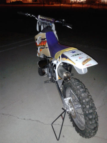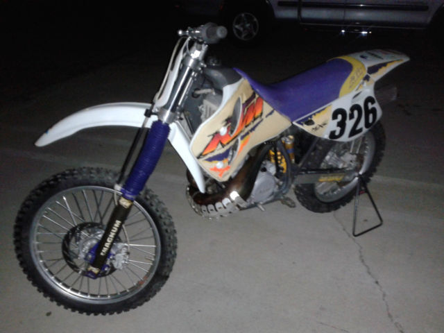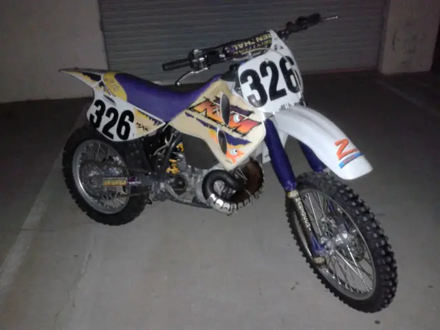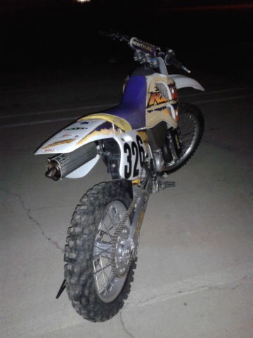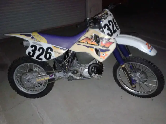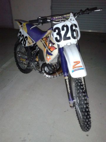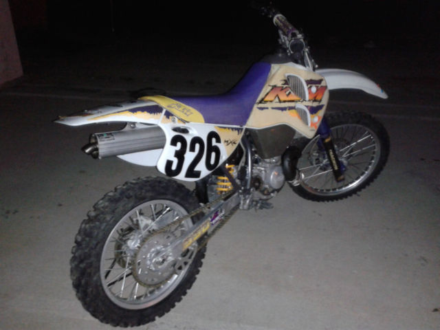 1995 KTM 550MXC. low hour bike. ridden only one year then parked in the garage. I am selling this bike for a friend. bike is vet owned and maintained. Started occasionally and ridden up and down the street. This bike is smoother and more powerful than my KX500 or my CR500. The front forks have new seals and the rear suspension was professionally rebuilt by Noleen. here is southern California. I suggested he install a new front tire and so he agreed and will be installed before you pick it up. Back tire is 80% or so and no cracks or weather checking. If you have any questions feel free to email me via Ebay or call or text me at 1-760-628-6382. Normal wear and scuffs from riding and the graphics are curling on some edges. see pics. The bike went down at least once and there is a repair to the pipe bracket and the bracket for the pipe on the sub-frame. tabs were re-welded and line up perfectly and done right. cannot be seen as they are behind the side cover. Pipe has a ding behind the pipe guard and the guard made a small hole in the pipe which has been fixed properly as well with a small weld. No other issues that I saw when cleaning it up for listing. Happy to answer any questions and if you need more pics just ask. Mileage is an estimate only. there is no odometer on this motorcycle. Buyer is responsible for shipping. both payment and coordination. I will help your shipper load the bike. I do have some contacts for shipping that are pretty reasonable if you need help with that. No returns on this item as shipping is simply too expensive. be sure to ask all your questions prior to bidding