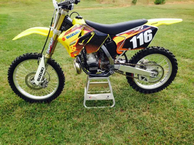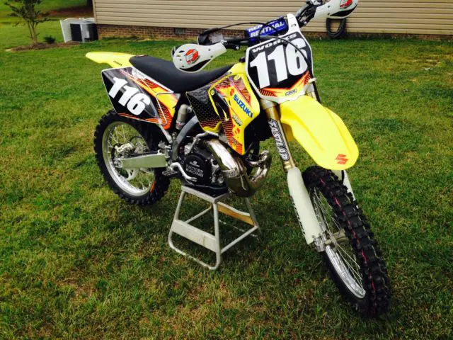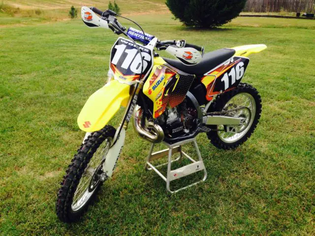 This is a 2008 RM 250 Suzuki. This is the last year that Suzuki built the 250 2 stroke. This is a keeper. Less than 20 total hours on bike. It has been ridden by a senior rider on trails and in the woods. The bike will come as you see it as well as with the stock seat cover. stock silencer. stock radiator shrouds and the stock engine covers. I have added a few after market parts for bling and performance. PC Platinum PipePC 304 Shorty Factory Sound silencerFast Lap Suspensiongripper seat coverBoysen Racing Clutch coverBoysen Racing Ignition coverTwin Air filterRenthal chainFactory Effex black all gripper seat coverEE handguardsPro Taper pillow top gripsSteahly 10oz FWWThis bike is as clean and runs as good as it looks. It is ready to ride. race or keep. There is no surprises with this bike. If you are looking for a low hour. super clean. last year made RM 250. here it is. I will add a picture of the bike in stock parts as you can take it back to that look or create your on. If you have any questions you can send me a e-mail through ebay or text me at 2five6 4five8 zero8zero9. Thanks