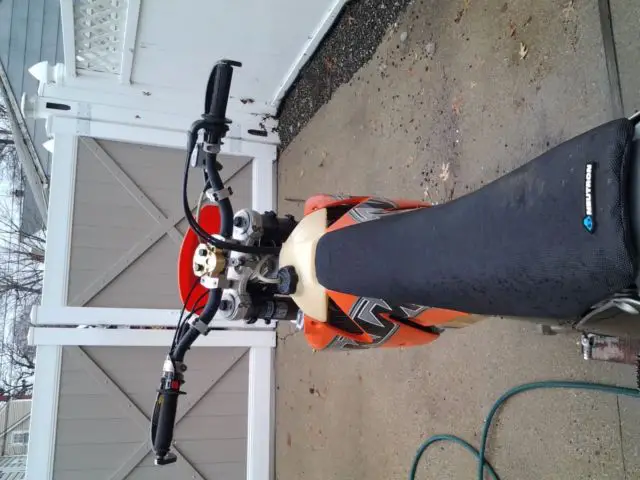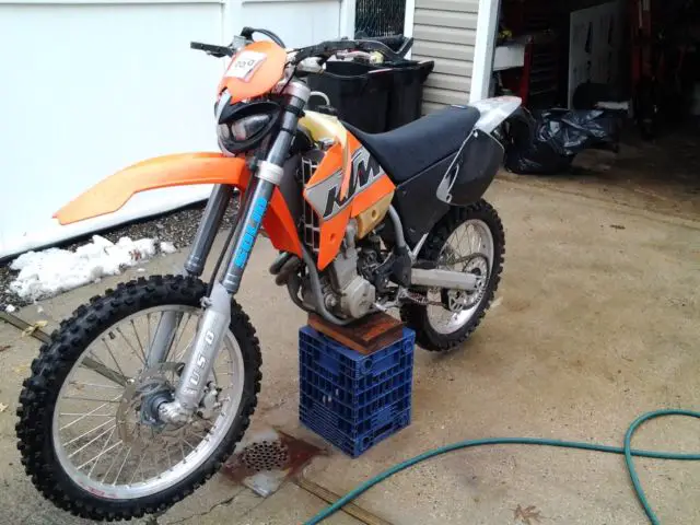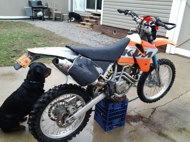 Hi everyone. Im selling my 2000 520 sx. I am the second owner and have had this bike quite a few years.the bike was at dealers last year and got a 100% check up.the motor and transmission is at its best.the suspension is set up for woods riding for a 220 pounder,it has brand new brakes, ires and gripper seat .the damper is not included because it is going on my new bike but had new fat bars.the bike has a atv registration and the headlight is just for show so it has no electric stator.the bodywork does have usual woods riding scratches but that's it.there is no reserve so high bidder wins.it is also on craigslist so i reserve to end aution early.can help with shipping within 100 miles of 11550 for a price after full payment please email for any questions thanks