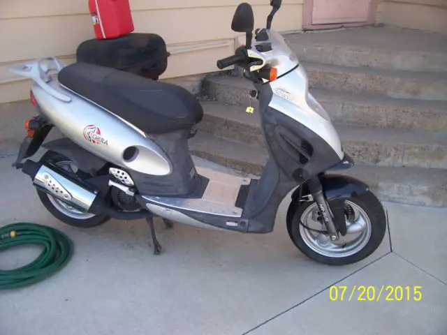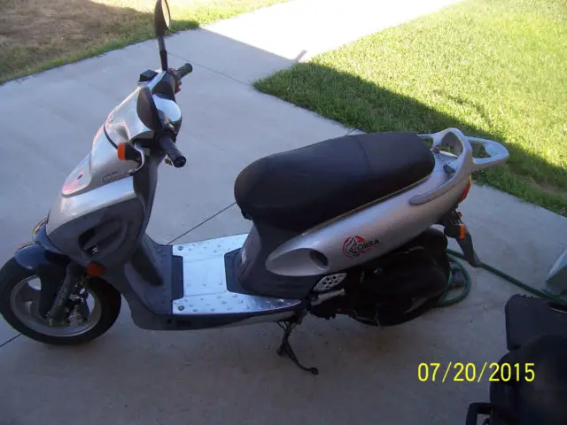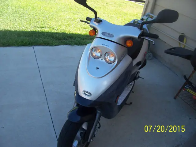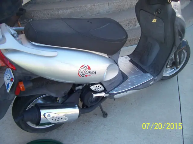2001 KYMCO COBRA RACING SCOOTER, ilver in color, as some miner damage to right side of scooter, as new battery and tune up, storage compartments. 1 under the seat and 1 under the gauge cluster. has kick start and key. all lights, orn and brakes work. has a manual some tools that come with it. buyer is responsible for shipping fees, eller will not make arrangements for or deliver to customer.