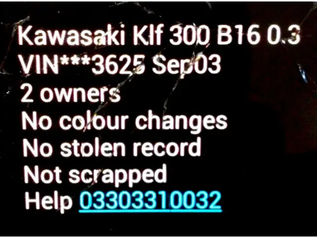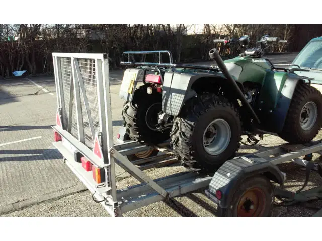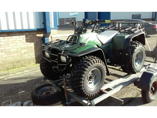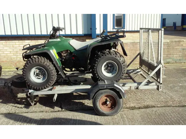 KAWASAKI KLF 300 4X2 FARM QUAD BIKE COMES WITH THE TRAILERGREAT CONDITIONFOUR NEW TYRES ALL BREAKS AND LIGHTS WORK REAR AXLE LOCKFULL SERVICEDREGISTERED BUT NEW OWNER MUST SEND FOR V5LAST PICTURE IS HPI REPORTTRAILER IS LOCKED ON THE KEY. ALL LIGHTS WORKCASH ON COLLECTION MORE INFORMATION 07521040621