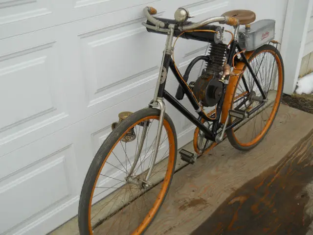 Features of the bicycle include:Â A front "spoon brake". cork handlebar grips. a nickeled handlebar bell and a leather saddle. Â Â A “New York Standard” watch cyclometer. Â A very ornate "Search Light" gas lamp made in Bridgeport. CT. Â Beautiful matching wood rims. wood rear fender and wood chain guard. Â All nickel plating was done when the bicycle was restored. it still shows well. there is no peeling. flaking or pits. Â The tube mounted on the handlebar is a 6 volt battery tube. nbsp; period correct wiring was used. The coil is mounted under the seat. The rear wheel sheave is missing from this motorcycle but I will include a sheave and some leather belting that can be modified and install by the new owner. Â The motorcycle shows very well. but with an older restoration it has some cosmetic flaws (i. e. paint chips). Â I reserve the right to end this auction early as I have this Motorcycle listed for sale locally. Â High bidder is responsible for pick-up. nbsp; I can assist your shipper on my end. Â The motorcycle MUST be paid for within 7 days of auction ending. Â The motorcycle will be released for pick-up or shipping after payment has cleared my bank. Â I can store the motorcycle up to 30 days after auction ending. Â Please ask ANY AND ALL questions prior to bidding. Â If you would like to speak with me in person I can be reached at 203-874-8666 early afternoons Monday - Friday. Â THIS MOTORCYCLE IS SOLD ~ AS IS ~ NO RETURNS. PLEASE. NO TIRE KICKERS. Â