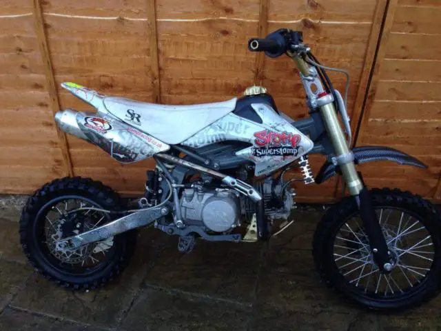 Up for sale due to lack of us is my son's stomp pit bike its the 140 cc engine it is a quick bike! it starts runs and runs spot on with no faults it has a new clutch leaver and chain fitted also we have a brand new set of michelin tyres that can be added for the right deal