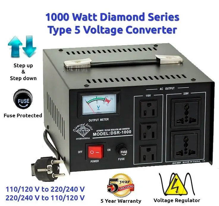 The International DSR-1000 Diamond Series 1000 Watt Type 5 Voltage Converters offer best in class performance in Voltage transformers. Thoroughly tested to be free of defects in workmanship and materials and hand soldering insure excellent quality. An extra durable lifetime coil is included.
