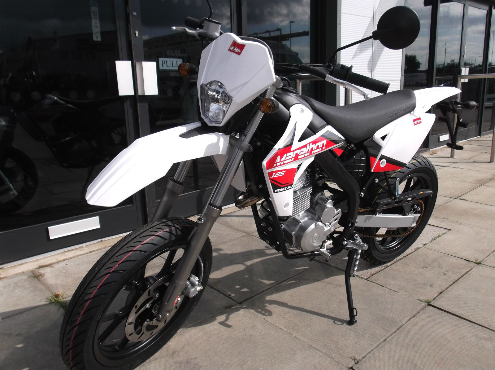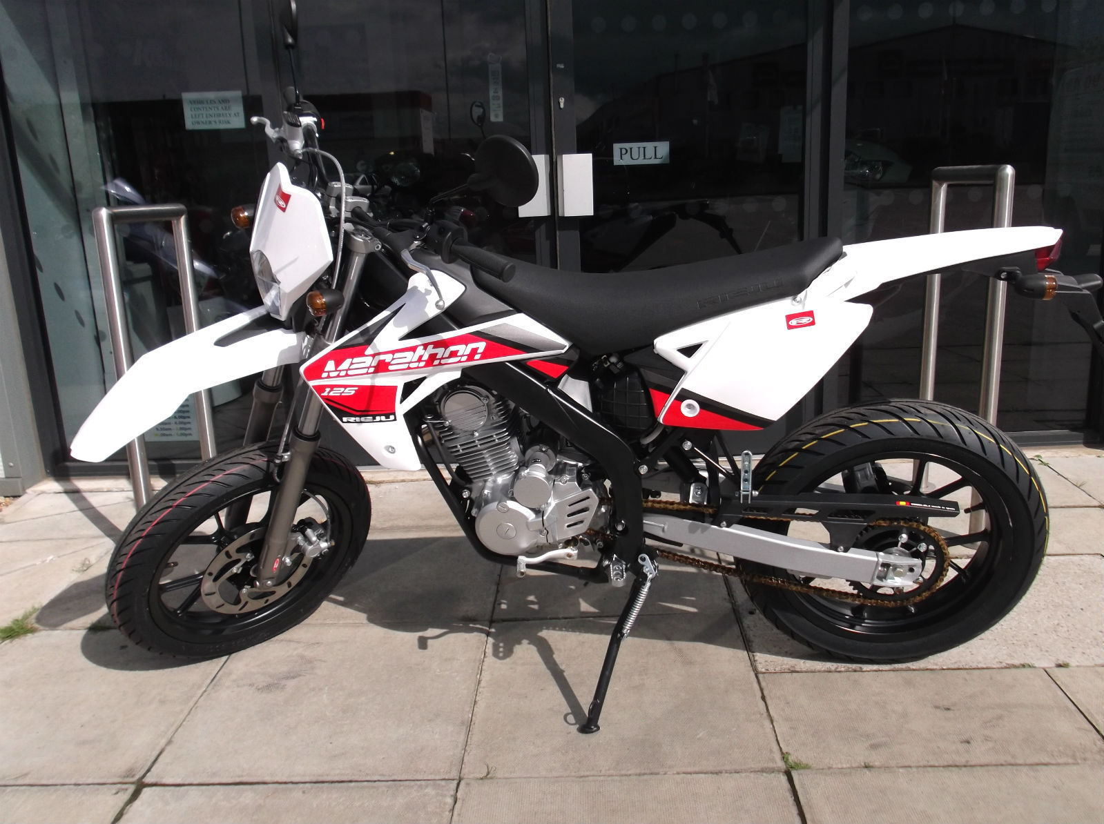 7 Year transferable parts and labour warranty. Available in either black/red or white/red. The Marathon MRT 125 SM AC is a popular choice. It has a 4 stroke 2 valve air cooled engine. It has excellent stopping power with hydraulic disc brakes front and rear. Supermoto tyres come as standard along with a stylish rear rack. 24 month parts and labour warranty. Please note add £100 to the above price to make it On The Road. this includes registration. 1 years tax. a gallon of petrol. a PDI from a qualified mechanic. registration plates and L plates should you need them. We accept all major credit cards. We can deliver just call us for a price. The Marathon 125 AC is positioned with the best quality / price within its market segment. The engine is a single-cylinder air-cooled. its structure and design is characterised by its low maintenance and frugal fuel consumption. combining a big bike feel with a quality ride perfect for your first motorcycle or commuting. The chassis is a steel dual beam perimeter. 260 mm brake disc at the front and 200 mm at the rear. Alloy rear rack as standard. Whether you prefer on road Supermoto style or on/off enduro spec the Marathon offers a great package for all riders The initial manufacturer?ˆ™s warranty applies for the 12 or 24 month period (depending on the manufacturer). During this period. the manufacturer?ˆ™s service intervals and warranty conditions apply. After this period expires. services must be done every 2500 miles or 6 months. whichever occurs first. To qualify for the 7 year warranty the vehicle must be serviced by PB Motorcycles and Quads Ltd for the duration of the warranty period from year one through to and including year 7. The PB Motorcycles and Quads Ltd warranty will match the manufacturer?ˆ™s warranty along with the manufacturer?ˆ™s exclusions eg reasonable wear and tear or misuse. See warranty book for complete conditions. It does not cover breakdown recovery. Virtually all of our motorcycles produce more than 100 miles per gallon. 50cc and 125cc bikes are only £17 a year to tax. On top of that. bike insurance is thousands of pounds cheaper than car insurance. Parts are readily available for every bike we stock; we do not fall into the cheap Chinese scooters?ˆ™ category where parts are unavailable. All of our suppliers have UK based warehouses stocked with parts. On top of this. every bike we sell has a thorough pre delivery inspection by our qualified technicians. where we put together the motorcycle and check every component we can. Once the pre delivery inspection is completed. your motorcycle has a road test. ( All specification figures can vary without notice). 3 years free legal expense insurance worth £75. We are open Monday to Friday 9 - 6 | Saturdays 9:30 - 4 | Sundays 10 - 3Nationwide Delivery Available - Please ring us for a priceInsurance: We recommend Rampdale insurance. 0844 815 6125 bike@rampdale. com. Our dealer reference number is 212784. you can use this to get a discounted rate. Please visit our showroom or phone for more info! 01733 312195