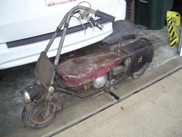 As a collector and restorer, his is the kind of bike I like to find because almost all the original parts are there. The gas tank is buggered (but solid), rake lever missing the footstep, ens absent, mall taillight not there. Everything else I believe including the very good TERRY seat is in place. Right handlebar broke where the cables exit.. Engine turns over freely with indication of compression, riginal Corgi decals in place on the L/R sides. Also have the lower engine shields shown in a separate photo. The pics tell it all. I don't know the history of this little guy, ut acquired it from a collector that had it in his loft for many years. There is no title, ill of sale (notarized) provided if requested. If you have 10 or less positive feedbacks, mail me prior to bidding with your name/address/and phone number. I will call and discuss the purchase requirements. I've listed with a local pick-up only, owever, ill work with the auction winner and accommodate individual or carrier pickup. I would recommend UShip or other carriers that specialize in bikes. Reserve will not be revealed, lthough I think it's reasonable considering what's there. Auction winner will be responsible for all pickup and shipping arrangement. Crating/etc. no available. Ebay mandated title note (listed clear - but bill of sale only). Mileage & year estimates only - have no idea. Corgi is offered "as-is/where-is" FOB Middletown, H 45042.