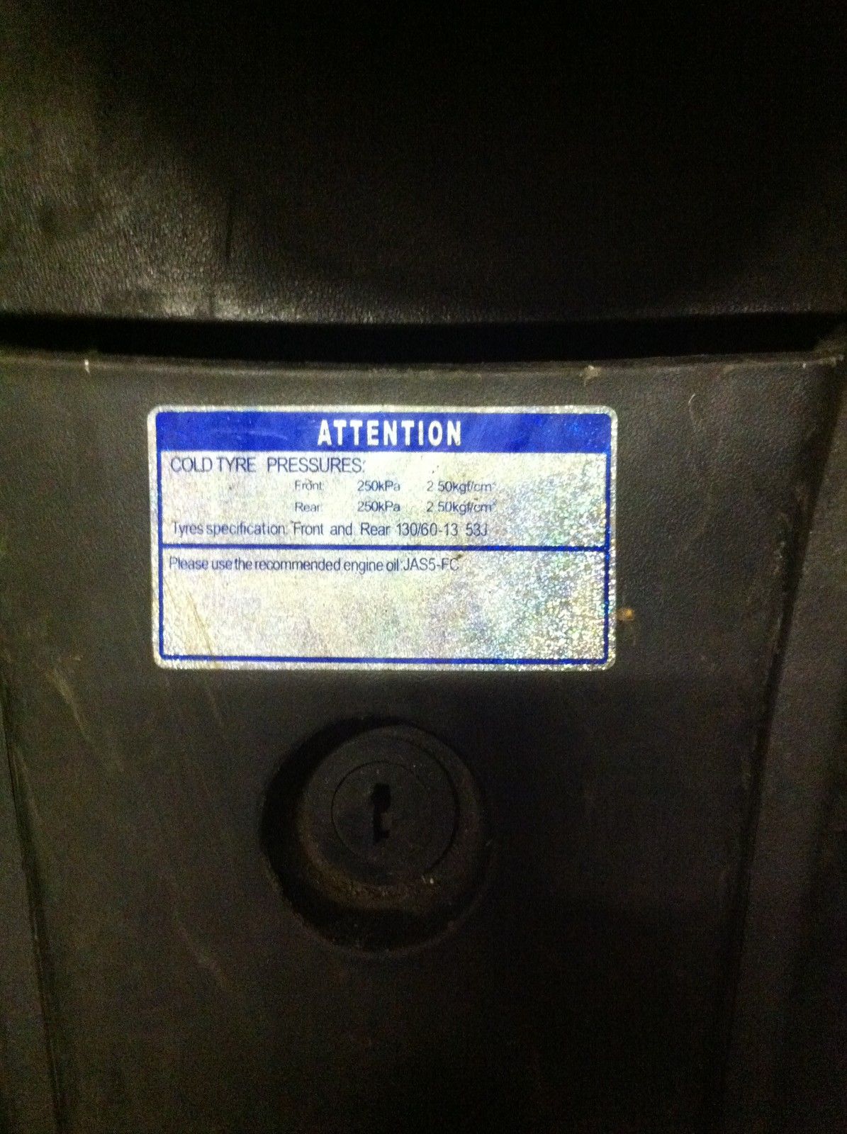 Dimensions: 1880x740x1200mmSeat Height: 815mmWeight: 92kgEngine Type: 2 Stroke Air CooledEngine Size: 49ccFront Wheel: 130/60 x 13?ˆ?Rear Wheel: 130/60 x 13"Max Speed: 30mph limitedSuspension: Single Rear Shock AbsorberBrakes Front: DiscsBrakes Rear: DiscsStart Method: Electric/Kick
