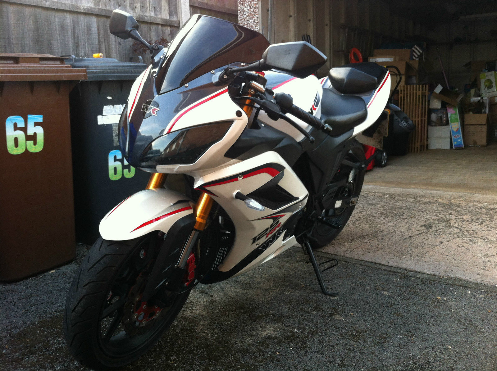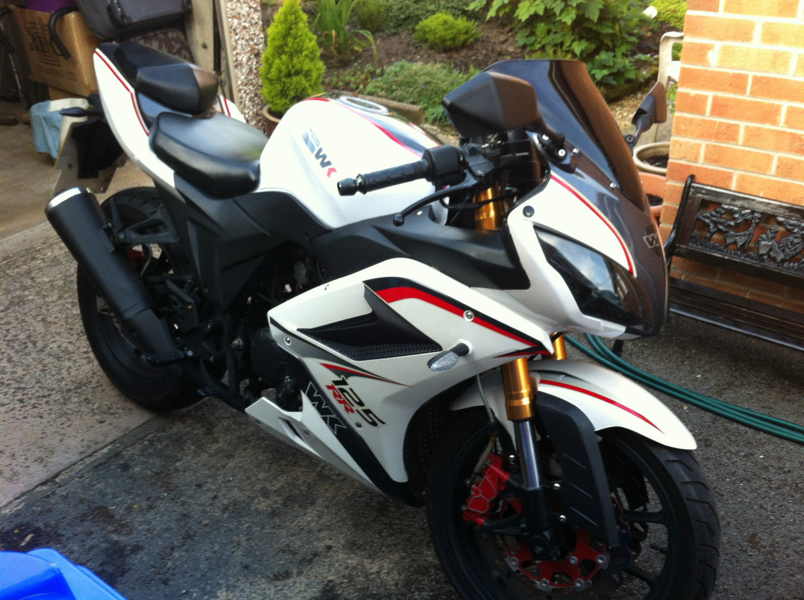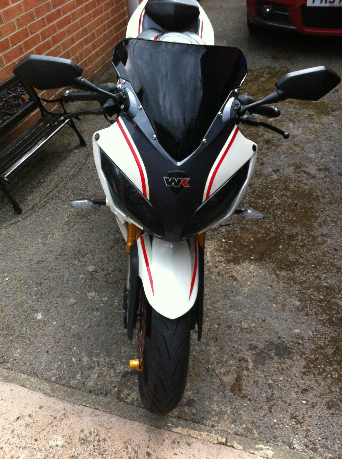 WK125RRHERE WE HAVE IS MY WK125RR BIKE FOR SALE. IT IS ONLY 1. 5 YEARS OLD AND DOSN'T NEED A MOT TILL MARCH 2016. IT IS FINISHED IN THE AMAZING PEARL WHITE COLOUR AND HAS ONLY DONE 1500 MILES AND RIDES FANTASTIC. IT HAS JUST HAD A FULL SERVICE AT A MOTORCYCLE SPECIALIST WHICH HAS BEEN STAMPED IN THE SERVICE BOOK. IT HAS 2 KEYS AND COMES WITH A DISC LOCK. IT IS FULLY HPI CLEAR AND HAVE ALL THE PAPERWORK. IT IS IN VERY GOOD CONDITION BUT DOES HAVE A SMALL SCUFF ON SIDE NEAR FRONT HEADLIGHT DONE BUY PREVIOUS OWNER BUT CAN HARDLY BE SEEN. THE ONLY REASON FOR SALE IS I DONT REALLY USE IT MUCH AS I HAVE A CAR. THE BIKE HAS NEVER BEEN RIDDEN IN THE WET AND HAS ALWAYS BEEN RUN ON V POWER FUEL AND POLISHED WEEKLY. CASH ON COLLECTION ONLYNO TEST RIDES WITHOUT FULL PAYMENT IN MY HANDNO TIMEWASTERSTHANKS FOR LOOKING